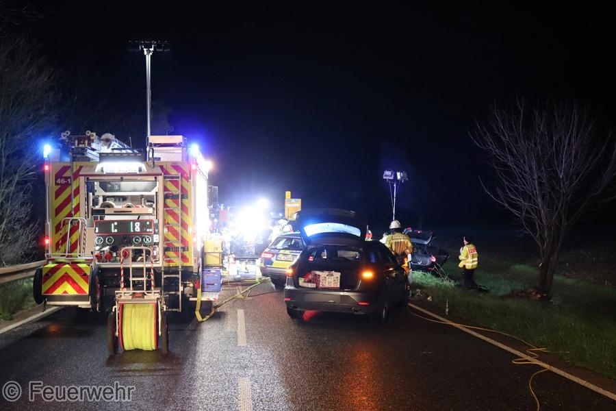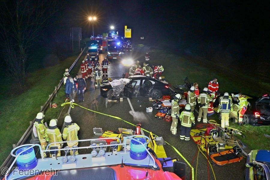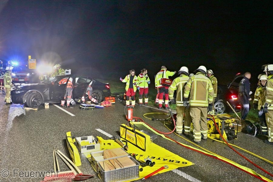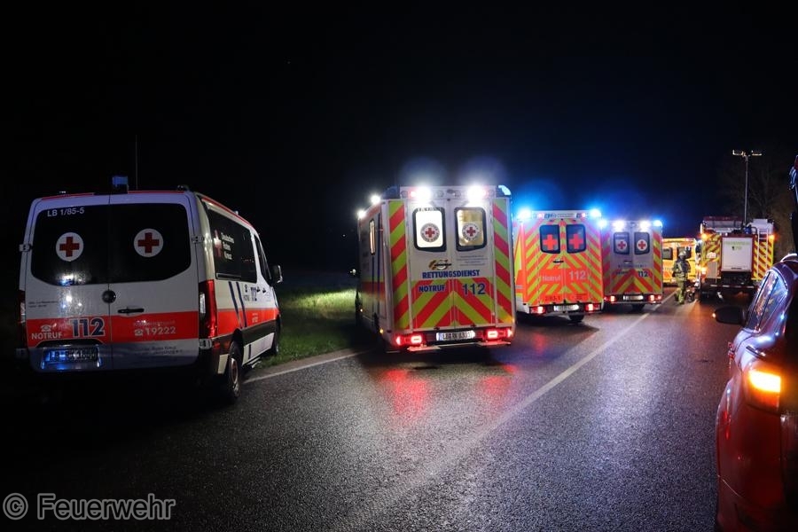 Die integrierte Leitstelle Ludwigsburg alarmierte die Feuerwehr zu einem Verkehrsunfall mit eingeklemmter Person auf die Bundesstraße 10. Dort war es zu einem Zusammenstoß zwischen zwei Fahrzeugen gekommen. Noch während der Anfahrt wurde das Alarmstichwort erhöht und die Feuerwehr Markgröningen mit dem Rüstwagen und einem weiteren Hilfeleistungslöschfahrzeug nachalarmiert. Beim Eintreffen der Feuerwehr befand sich in jedem Unfallfahrzeug eine Person. Vier weitere betroffene Personen befanden sich bereits außerhalb der Fahrzeuge. Durch die Feuerwehr wurde die Einsatzstelle abgesichert und ausgeleuchtet sowie die Befreiung mit hydraulischem Rettungsgerät eingeleitet. Zudem wurde der Rettungsdienst bei der Patientenversorgung von insgesamt sechs Verletzten unterstützt. Im Anschluss wurde die Einsatzstelle für die Unfallaufnahme der Polizei großräumig ausgeleuchtet. An der Einsatzstelle befanden sich neben der Feuerwehr auch die Polizei, der Rettungsdienst mit zwei Notärzte und die Straßenmeisterei.