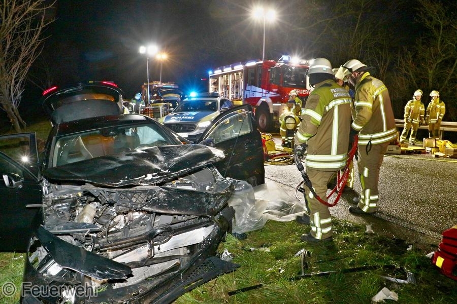 Am Samstagabend, gegen 20:00 Uhr, ereignete sich ein schwerer Verkehrsunfall zwischen zwei Fahrzeugen auf der B10 Höhe Schwieberdingen-Ost. Der 17-jährige Fahrer eines BMW befuhr die B10 von Stuttgart kommend in Fahrtrichtung Schwieberdingen. Mutmaßlich aufgrund der nicht an die Witterungsverhältnisse angepassten Geschwindigkeit verlor der BMW-Fahrer die Kontrolle über sein Fahrzeug, kam nach rechts von der Fahrbahn ab, durchfuhr den Grünstreifen, fuhr auf die Regelabsenkung der Schutzplanke und schleuderte quer zur Fahrbahn in den entgegenkommenden Mercedes. Die 27-jährige Fahrerin des Mercedes und der 16-jährige Beifahrer des BMW wurden hierbei schwer verletzt und mussten durch die Feuerwehr aus den Fahrzeugen geborgen und anschließend in umliegende Krankenhäuser verbracht werden. Der 17-jährige Fahrer des BMW, sowie die zwei 14-jährige und ein 15-jähriger Mitfahrer des BMW wurden leicht verletzt und kamen ebenfalls in umliegende Krankenhäuser. Bei dem Verkehrsunfall entstand ein geschätzter Sachschaden von etwa 133.000 Euro. Beide Fahrzeuge waren nicht mehr fahrbereit und mussten abgeschleppt werden. Die Feuerwehr, der Rettungsdienst, die Straßenmeisterei Vaihingen und das Polizeipräsidium Ludwigsburg hatten mehrere Fahrzeuge eingesetzt. Zur Unfallaufnahme, Bergung der Fahrzeuge und Reinigung der Fahrbahn musste die B10 im Bereich der Unfallstelle für etwa 5 Stunden gesperrt werden.