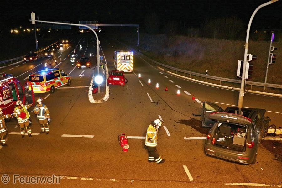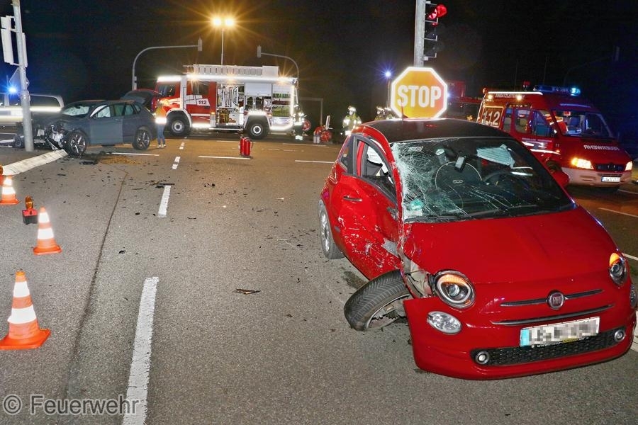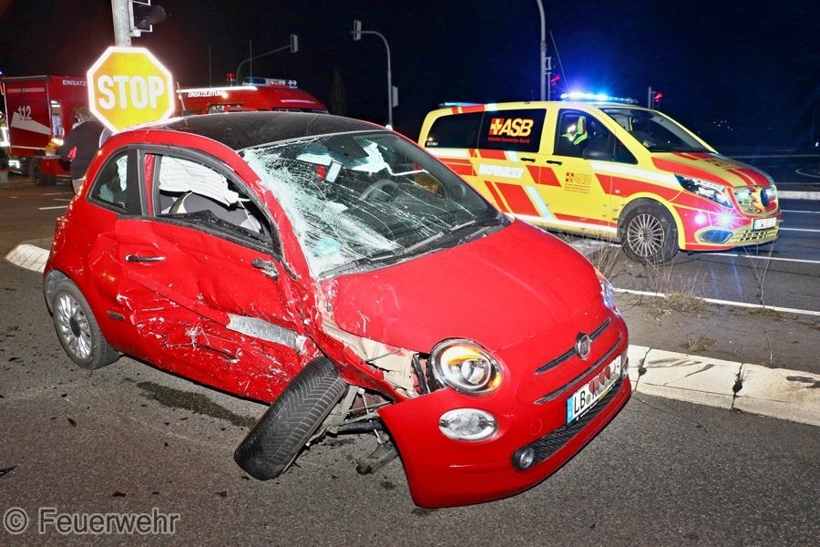 Eine schwer verletzte und eine leicht verletzte Person sowie 50.000 Euro Schaden ist die Bilanz eines Verkehrsunfalls am Sonntagabend kurz vor 19:00 Uhr im Kreuzungsbereich. Eine 64-jährige Lenkerin eines Fiat befuhr die Landesstraße 1141 von Markgröningen kommend und wollte an der Kreuzung zur Landesstraße 1140 nach links in Richtung Ludwigsburg weiterfahren. Ihr kam ein 27-jähriger Lenker eines Seat entgegen, welcher seinerseits auf der L 1141 geradeaus über die Kreuzung in Richtung Markgröningen fahren wollte. Beide Fahrzeugführer fuhren in den Kreuzungsbereich ein, wobei nach derzeitigem Ermittlungsstand die 64-Jährige das für sie geltende Rotlicht der Lichtzeichenanlage missachtete, der 27-Jährige hatte "Grün". Im Kreuzungsbereich kollidierte der Seat frontal mit der Beifahrerseite des Fiat. Die 64-Jährige erlitt schwere Verletzungen und musste mit einem Rettungswagen in ein nahegelegenes Krankenhaus verbracht werden. Der 27-Jährige wurde leicht verletzt und konnte das Krankenhaus nach ambulanter Behandlung wieder verlassen. Beide Fahrzeuge waren nicht mehr fahrbereit und mussten abgeschleppt werden. Zur Klärung des Unfallhergangs ordnete die Staatsanwaltschaft Stuttgart ein Gutachten an. Die Unfallstelle war während der Unfallaufnahme und Bergung der Fahrzeuge bis kurz vor Mitternacht gesperrt. Eine örtliche Umleitung war eingerichtet. Der Rettungsdienst war mit zwei Rettungswagen und einem Notarzt vor Ort. Die Feuerwehr aus Schwieberdingen war zur Absicherung und Sperrung der Unfallstelle mit drei Fahrzeugen und 22 Einsatzkräften an der Unfallstelle. Das Polizeipräsidium Ludwigsburg hatte drei Streifenbesatzungen im Einsatz.