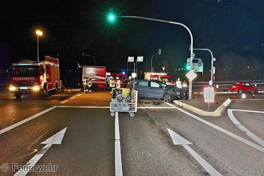 Zu einem Verkehrsunfall mit zwei beteiligten Fahrzeugen wurde die Feuerwehr zur Weinstraßenkreuzung alarmiert. Die verletzten Personen wurden bis zum Eintreffen des Rettungsdienstes durch die Feuerwehr betreut. Die Einsatzstelle wurde abgesichert und ausgeleuchtet. Außerdem wurde der Brandschutz sichergestellt sowie ausgelaufene Betriebsmittel abgebunden. Ebenfalls an der Einsatzstelle waren der Rettungsdienst und die Polizei mit mehreren Fahrzeugen.