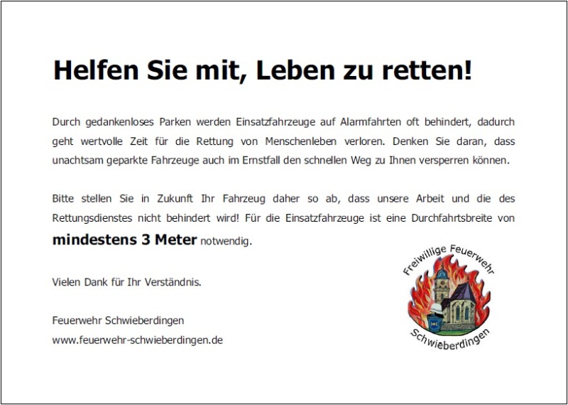 Auch bei der diesjährigen Rundfahrt von Feuerwehr, dem Ordnungsamt und Vertreterinnen und Vertretern des Gemeinderates wurden an einigen Stellen im Ortsgebiet Parkverstöße festgestellt, bei denen ein Rettungsfahrzeug im Ernstfall nicht durchgekommen wäre. Parkverstöße wurden dabei nur in besonders kritischen Fällen mit einer Verwarnung geahndet. Ansonsten wurden die Fahrzeughalter mit einem Informationsblatt der Feuerwehr darauf aufmerksam gemacht, dass sie ihr Fahrzeug verkehrsbehindernd geparkt haben.