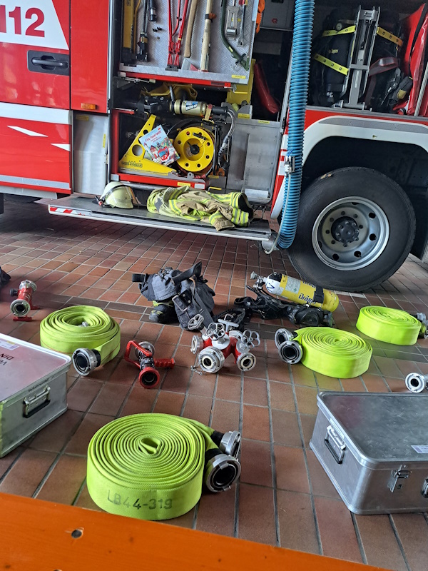Auf den Feuerwehrfahrzeugen in Schwieberdingen befinden sich die unterschiedlichsten Hilfsmittel zum Transport von Personen. Wir haben das Rettungstuch, das wie eine Windel angelegt werden kann und selbst durch das engste Treppenhaus passt. Außerdem steht uns die Schleifkorbtrage zur Verfügung – aufgebaut wie eine Wanne, sehr stabil, aber auch recht sperrig. Zusätzlich befinden sich auf den Fahrzeugen noch das Rettungsbrett und die DIN-Krankentrage.