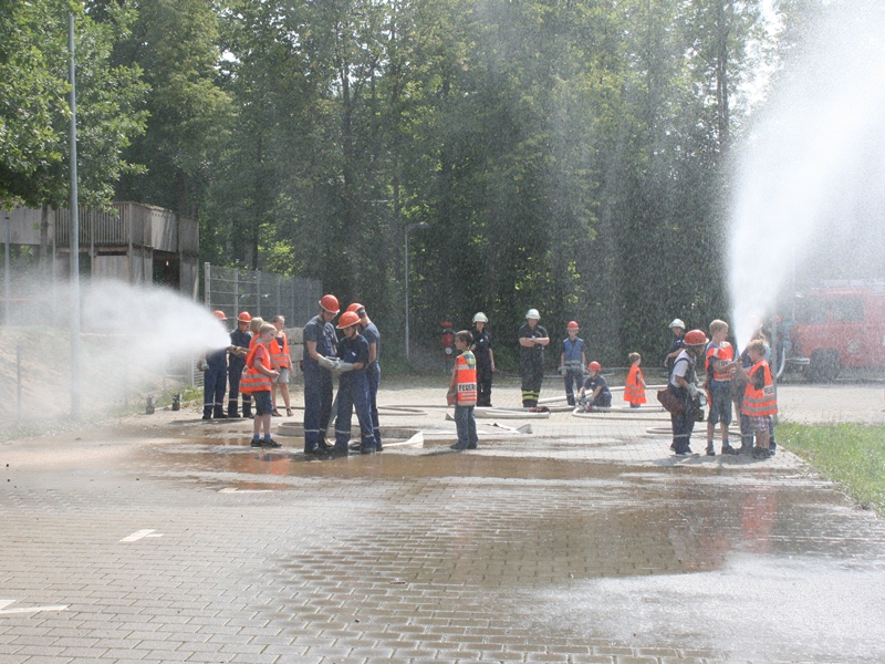 Im Anschluss an diese Theorie ging es zum Ersten richtigen Jugenfeuerwehreinsatz. Dazu hatten die Jugendlichen der Jugendfeuerwehr schon einen kleinen Löschangriff im Hinterhof aufgebaut. Da die Sonne richtig heiß war, machte die Nässe wenig aus und brachte eine willkommene Abwechslung.
