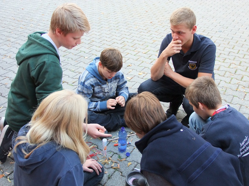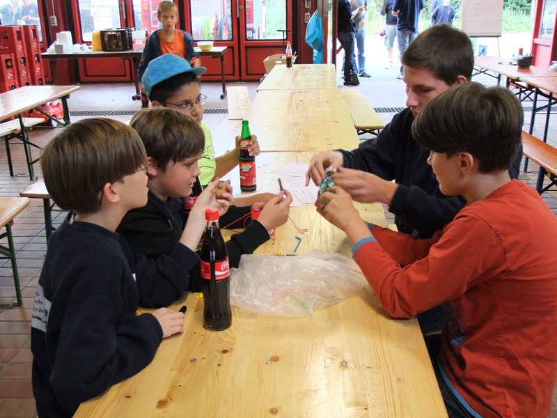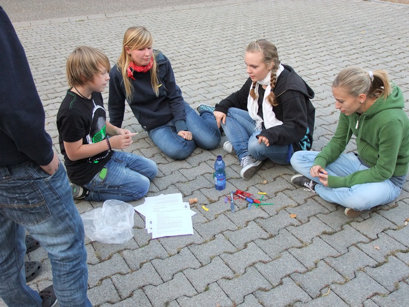 Um die Zeit vom Eintreffen bis zum Essen etwas zu überbrücken und kurzweilig zu gestalten, galt es für 8 wild gemischte Gruppen eine kleine Rakete zu basteln. So wurde das Feuerwehrgerätehaus kurzerhand zur Basis für eine Raketenabschussrampe. Durch die rege Beteiligung war auch der Bandschutz jederzeit sichergestellt. Nach der Vorstellung und den Startversuchen der Raketen wurde beim anschließenden Abendessen die technische Umsetzung noch einmal ausgewertet. Leider konnten einige Raketen auf Grund der Wetterbedingungen nicht starten...
