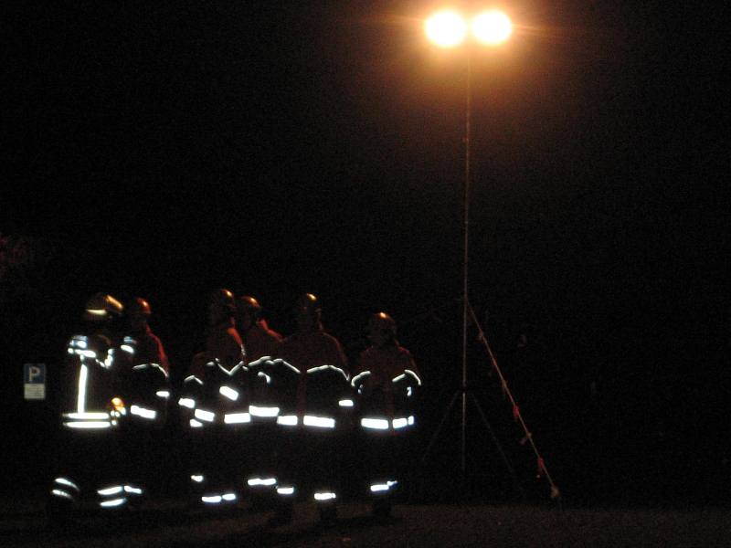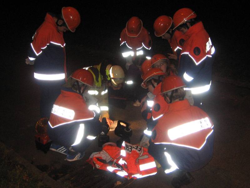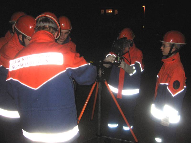 Währenddessen kümmerte sich die Gruppe der über 14-jährigen um die richtige Ausleuchtung der Einsatzstelle. Sie mussten einen großen Scheinwerfer mit Stativ aufbauen, das Stativ abspannen und die Kabeltrommel am Stromaggregat anschließen. Bis zu tausend Watt kann so ein Flutlicht haben!