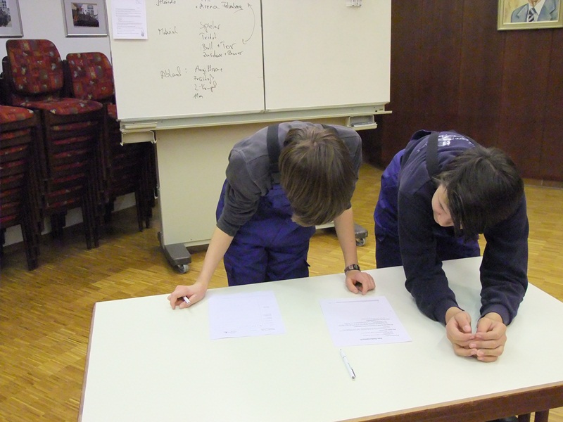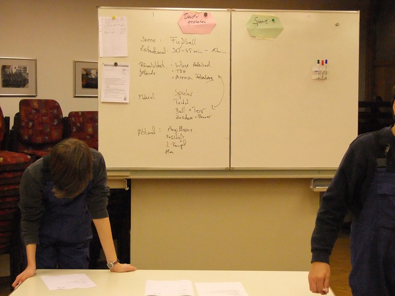 Am Donnerstag, bekamen einige Kinder endlich ihre lang ersehnten Stahlkappenschuhe. Das Thema des heutigen Abends war unser bevorstehendes Fotoshooting. Dafür schrieben wir Zettel, auf denen Fragen und ein bestimmtes Thema standen (z. B. benötigtes Material oder um welche Uhrzeit an welchem Ort man die Photos machen kann).