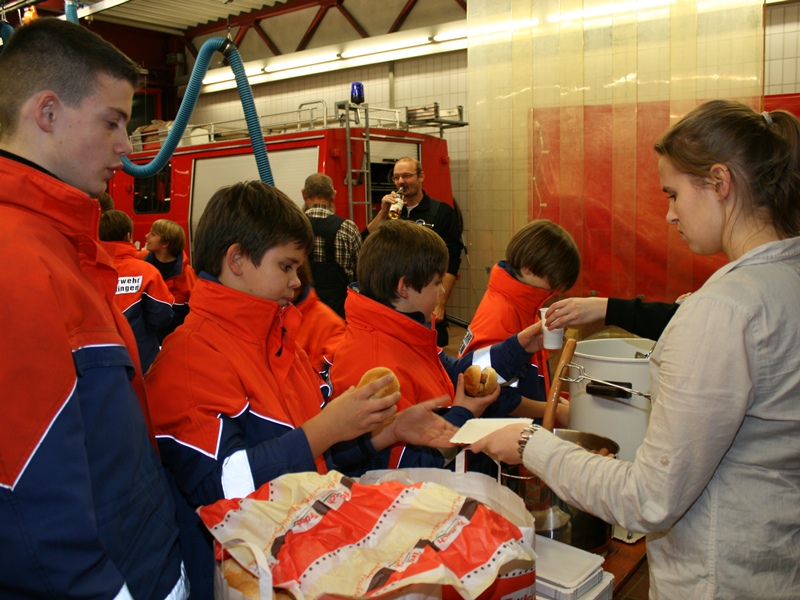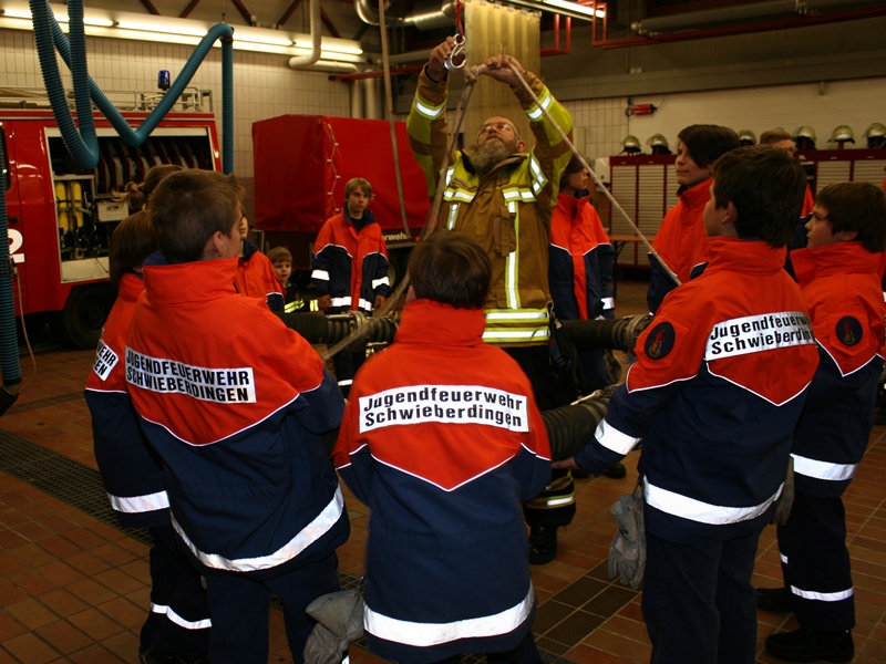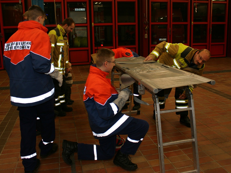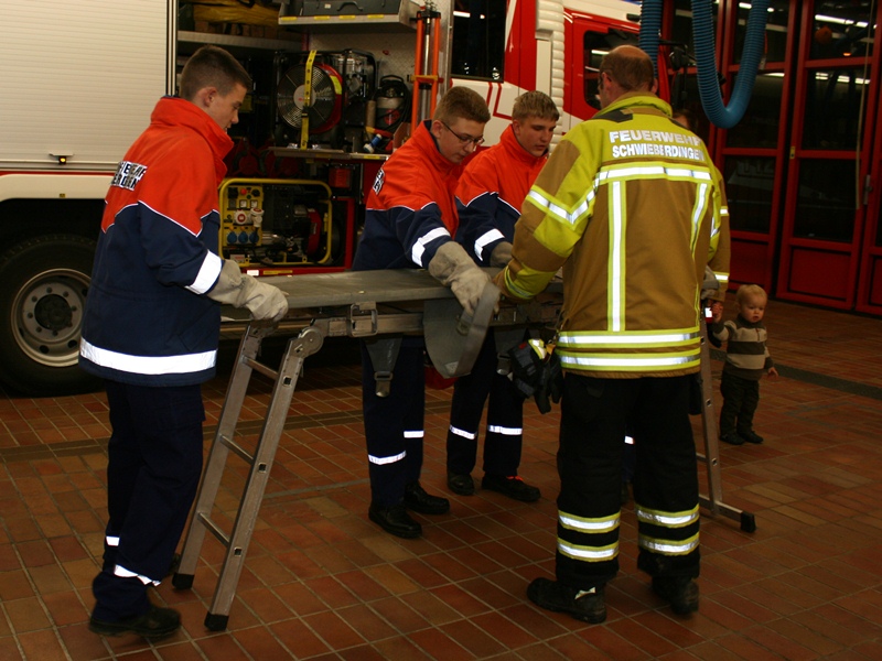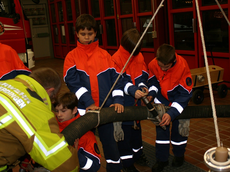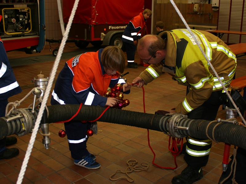Die Aufgabe der Gruppe der unter 14 jährigen bestand darin , aus Gerätschaften unseres LF 8 einen Adventskranz zu bauen. Dieser sollte dann im Feuerwehrhaus frei schweben, weihnachtlich dekoriert und mit Kerzen bestückt sein. Die zweite Gruppe der über 14 jährigen hatte die Aufgabe für das Christkind ein Bett zu bauen. Diese Aufgabe war sehr schnell erledigt, da die Jugendlichen die Klappleiter aus dem Löschgruppenfahrzeug verwendeten. Aufwendiger war dabei die Lösung der ersten Aufgabe. Das Ergebnis jedoch war umwerfend und bildete einen tollen Vorweihnachtlichen Abschluss des Jugendfeuerwehrjahres. Im Anschluss an die Knobelaufgaben gab es für alle noch eine kleine Stärkung und es gab Gelegenheit, sich mit den Helfern aus der Einsatzabteilung zu unterhalten, die diese Übung mit gestaltet haben.