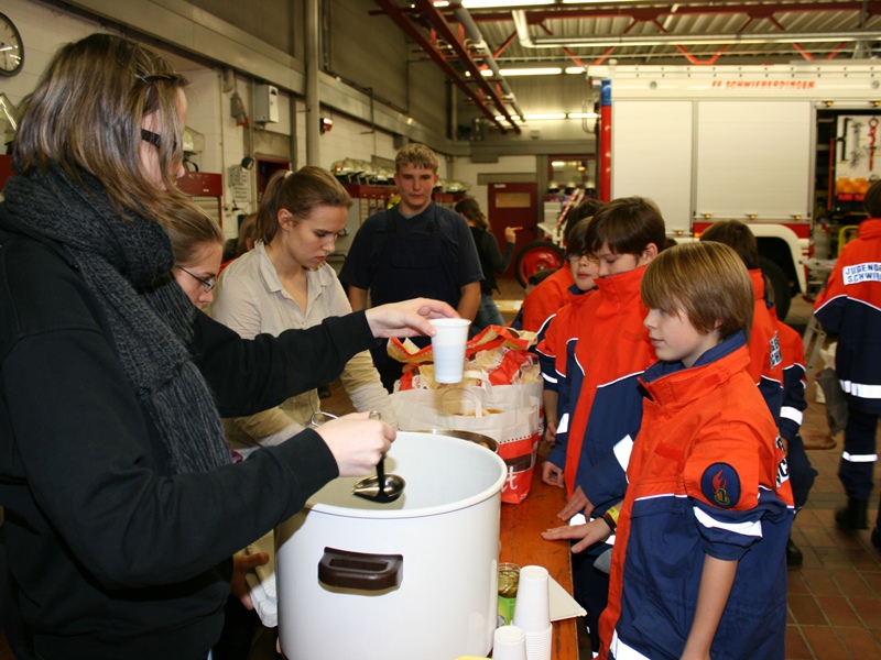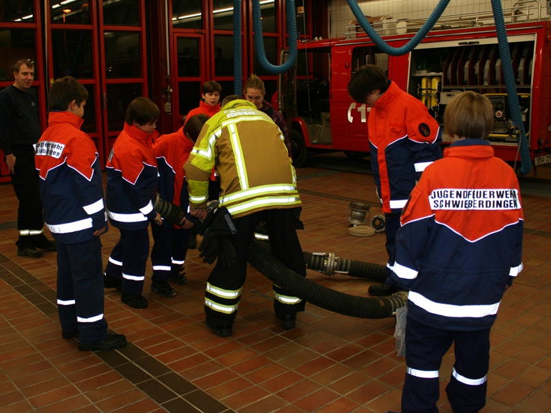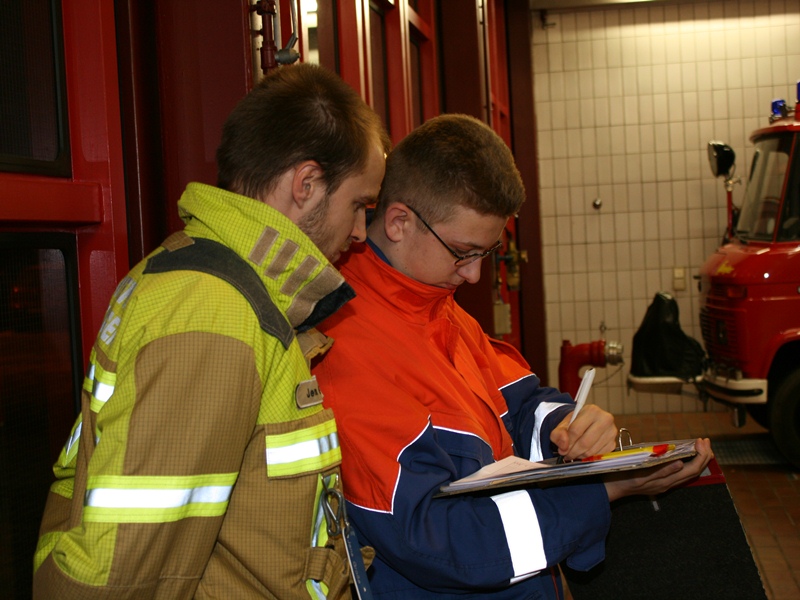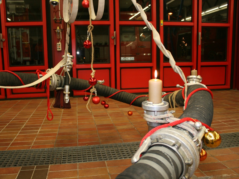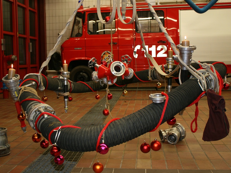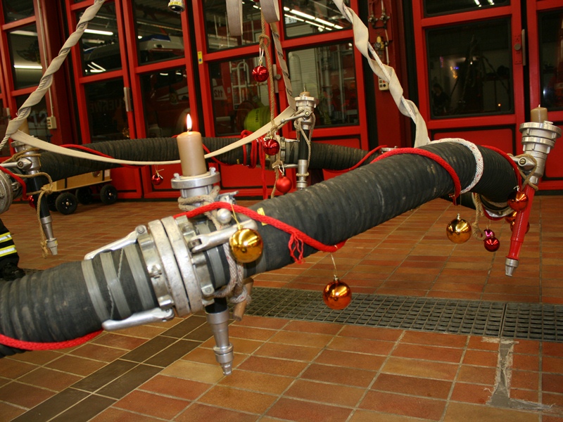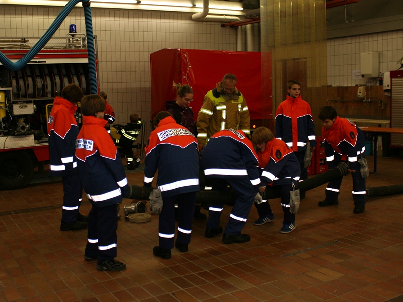 Die Aufgabe der Gruppe der unter 14 jährigen bestand darin , aus Gerätschaften unseres LF 8 einen Adventskranz zu bauen. Dieser sollte dann im Feuerwehrhaus frei schweben, weihnachtlich dekoriert und mit Kerzen bestückt sein. Die zweite Gruppe der über 14 jährigen hatte die Aufgabe für das Christkind ein Bett zu bauen. Diese Aufgabe war sehr schnell erledigt, da die Jugendlichen die Klappleiter aus dem Löschgruppenfahrzeug verwendeten. Aufwendiger war dabei die Lösung der ersten Aufgabe. Das Ergebnis jedoch war umwerfend und bildete einen tollen Vorweihnachtlichen Abschluss des Jugendfeuerwehrjahres. Im Anschluss an die Knobelaufgaben gab es für alle noch eine kleine Stärkung und es gab Gelegenheit, sich mit den Helfern aus der Einsatzabteilung zu unterhalten, die diese Übung mit gestaltet haben.