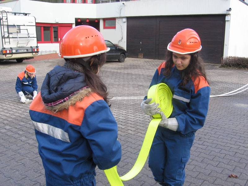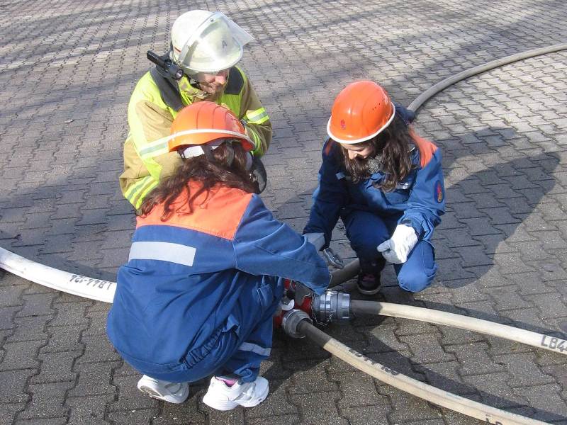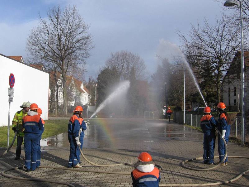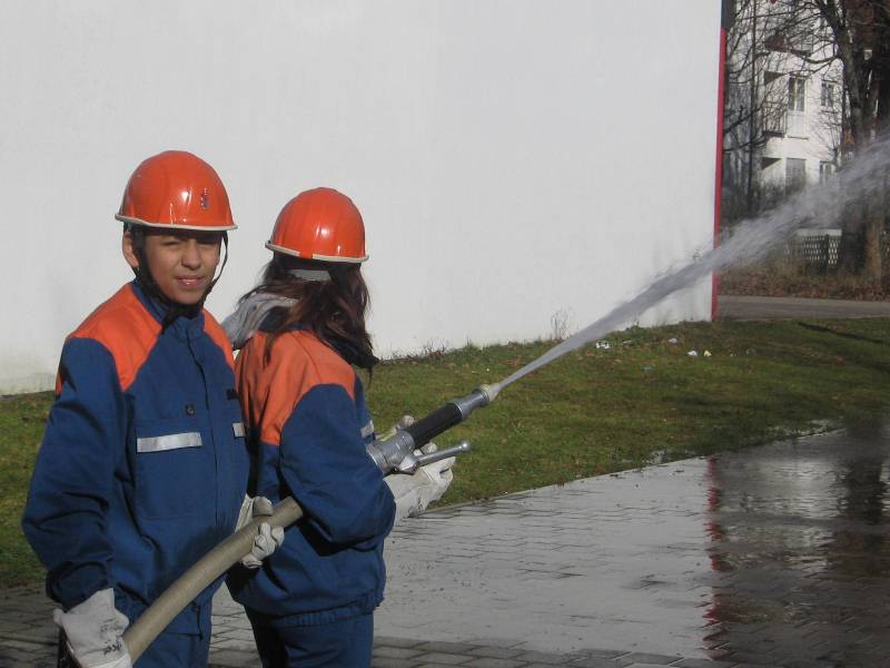 Stolz bin ich auf die Leistung der 7 Mädchen und 6 Jungen aus den Klassen 5 – 8, die in dieser Woche oftmals über sich hinausgewachsen sind. Bei wirklich ungemütlichen Wetterverhältnissen wurde jeden Tag vor dem Feuerwehrgebäude für die Abschlusspräsentation das Verlegen und Anschließen von Schläuchen trainiert. Ohne Vorkenntnisse haben die Jugendlichen die verschiedenen Positionen des „dreiteiligen Löschangriffs“ erlernt und konnten diesen als Team selbstständig ausführen.