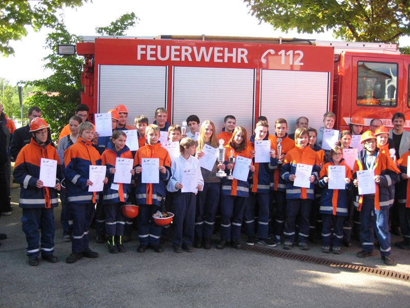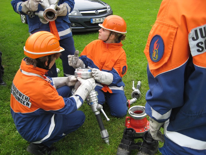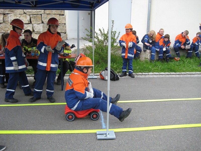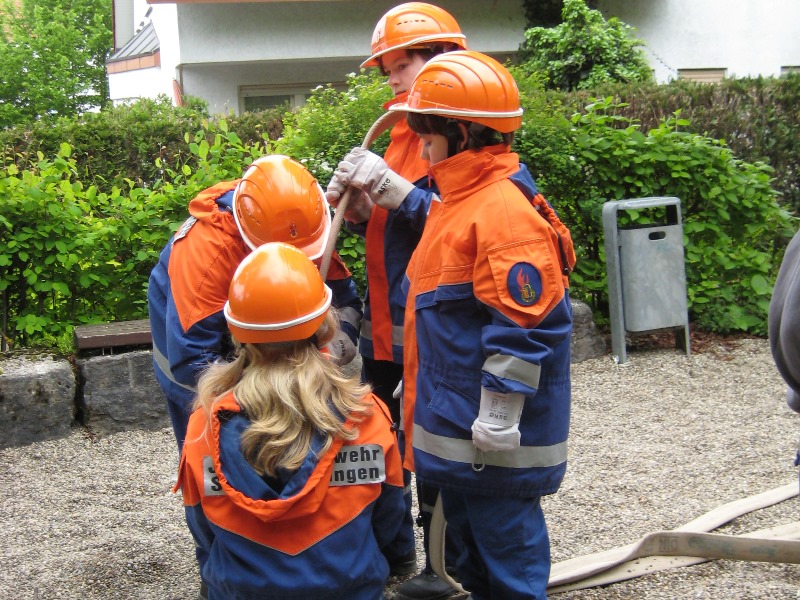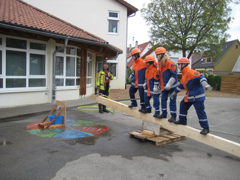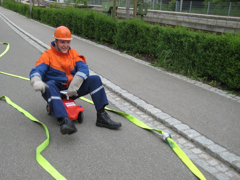 Weiter am Rathaus musste blind mit einem gespickten Helm Luftballons erstochen werden. An der Schule wurde mittels einer Wippe, von Jugendfeuerwehrler ausbalanciert, ein Eimer mit Wasser befüllt und unter erschwerten Bedienungen Schlauch-gekegelt.