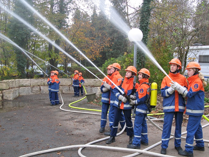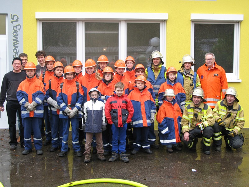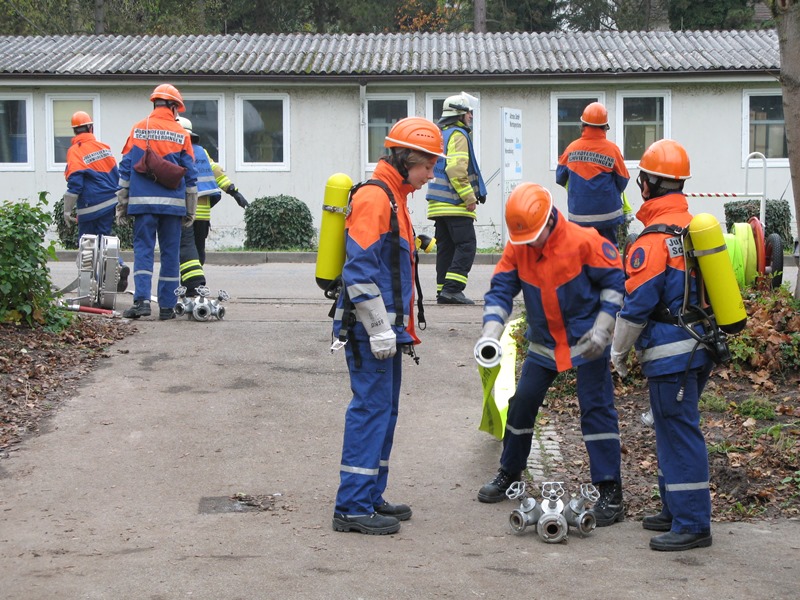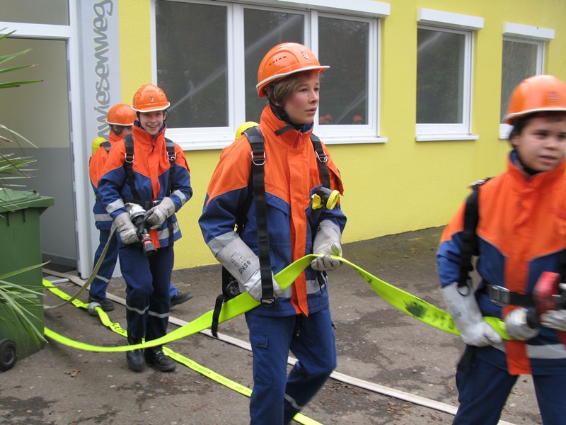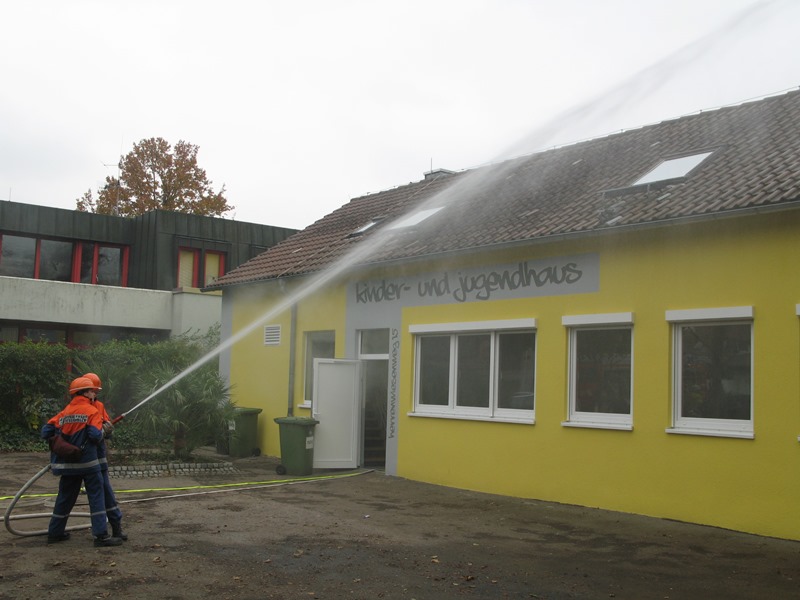Der Rauch wurde durch eine Nebelmaschine erzeugt. Kurz nach dem Eintreffen sicherten wir die Unfallstelle und der Angriffstrupp rüstete sich mit den Jugendfeuerwehratemschutzgeräten aus. 6 vermisste Personen, darunter Bürgermeister Spiegel, waren im Jugendhaus und spielten unsere “Opfer“. Mit der Wasserversorgung aus einem Unterflurhydranten bespritzten wir schließlich das ganze Jugendhaus. Leider ist so etwas Wasser durch die Fenster gelangt und es wurde innen ein wenig nass. Es entstand jedoch kein Schaden. Nachdem die Personen gerettet waren, alle Schläuche in die Autos zurück geräumt waren, spendierte man uns noch etwas leckeres zu Essen im Jugendhaus.