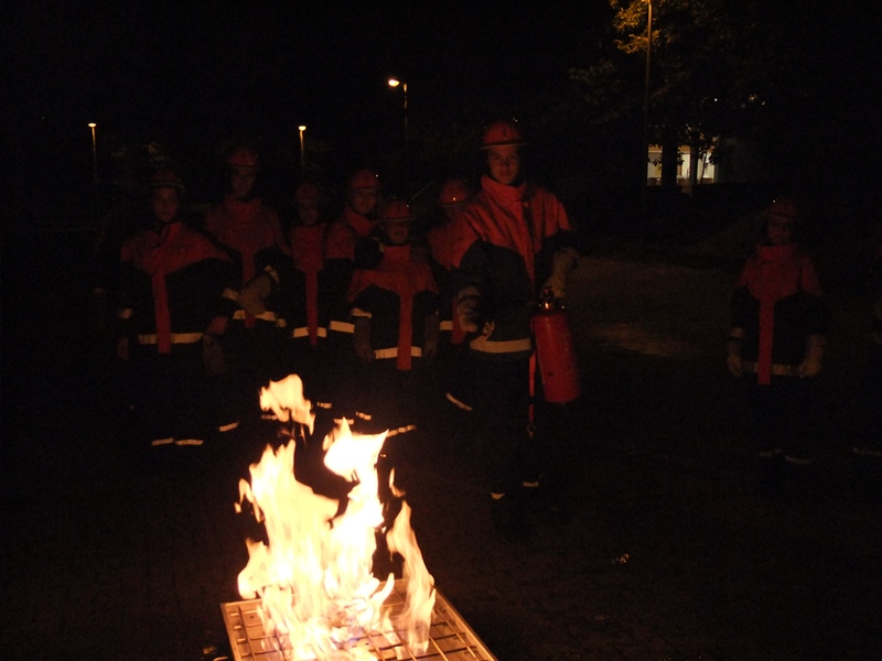 Begonnen hat die Übung mit einer kleinen Theorieeinheit. Warum brennt es und was sind die Brandklassen. Jeder Stoff hat ein spezielle Löschmittel und andere Gefahen. Diese zu erkennen ist die Hautaufgabe eines Feuerwehrmannes, also auch die der jungen Brandschützer. Das Wissen um den Notruf und dessen wurde wiederholt. Zum Abschluss der Übung hatten alle die Möglichkeit, mehrmals mit einem Feuerlöscher einen kleinen Papierkorbbrand zu löschen.