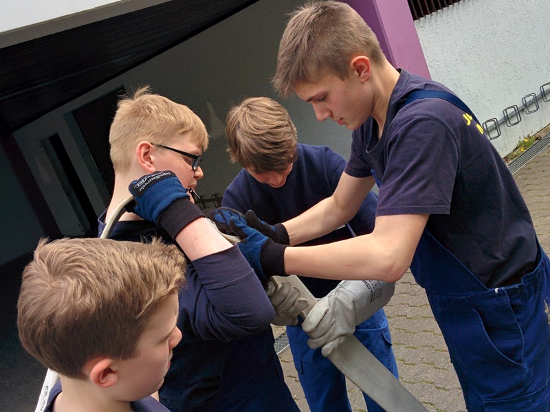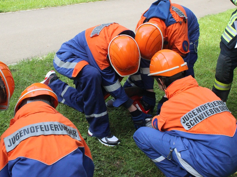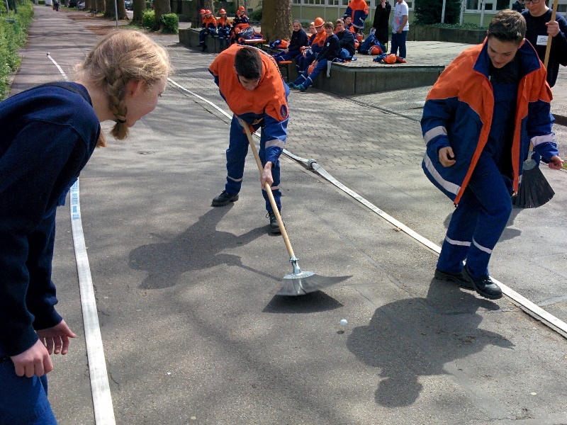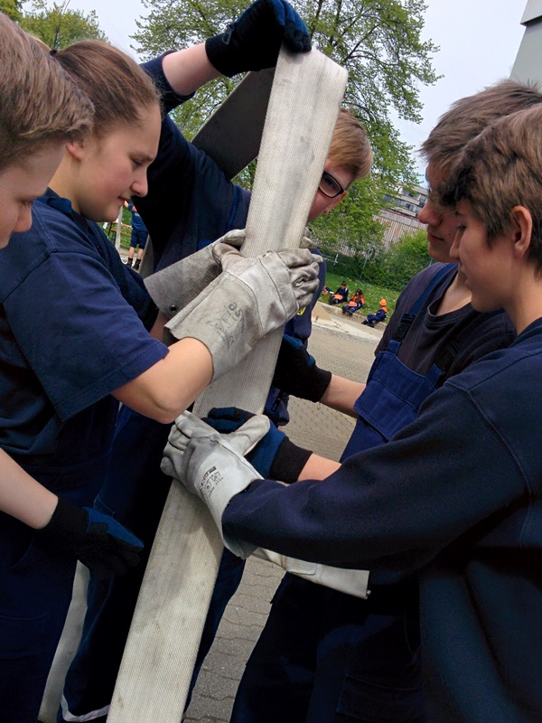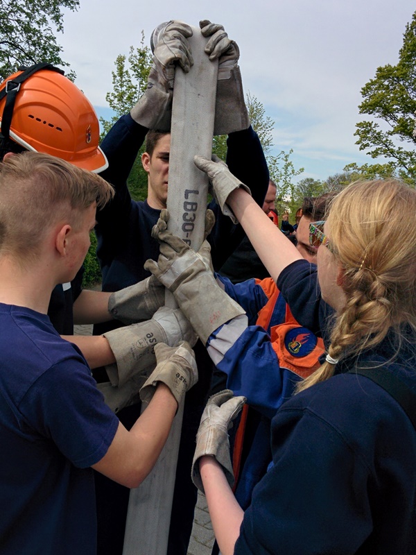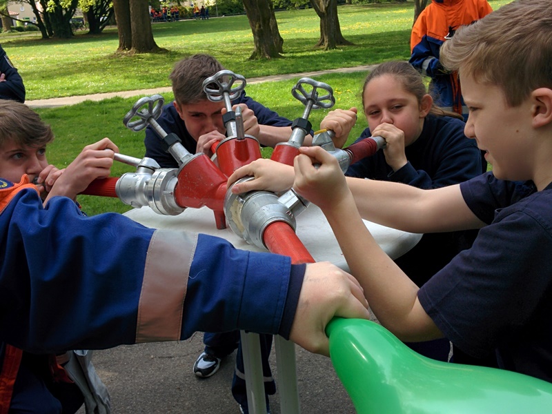 So galt es mit Feuerpatschen einen Tischtennisball über eine Strecke von 20 Metern zu befördern. Als besonders knifflig stellte sich auch die Aufgabe heraus, einen Golfball durch einen B-Schlauch zu befördern. Beinahe ging einigen die Puste beim Zerknallen eines Luftballons aus, mit vereinten Kräften stellte jedoch auch diese Station kein Hindernis dar. Bei herrlichem Sonnenschein ließ sich auch die ein oder andere Wasserstation mit Leichtigkeit ertragen.