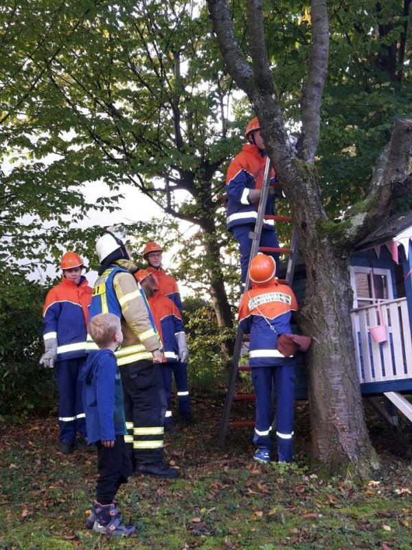 Ein kleiner Junge meldete, dass seine Katze schon seit mehreren Tagen auf einem Baum sitzt und nicht mehr herunterkommen würde. Angekommen in der Hermann-Essig-Straße wurde die Katze fachmännisch vom Baum gerettet. Mittels Steckleiter war es für die Jugendlichen kein Problem dem kleinen Jungen seine Katze wieder zu übergeben.
