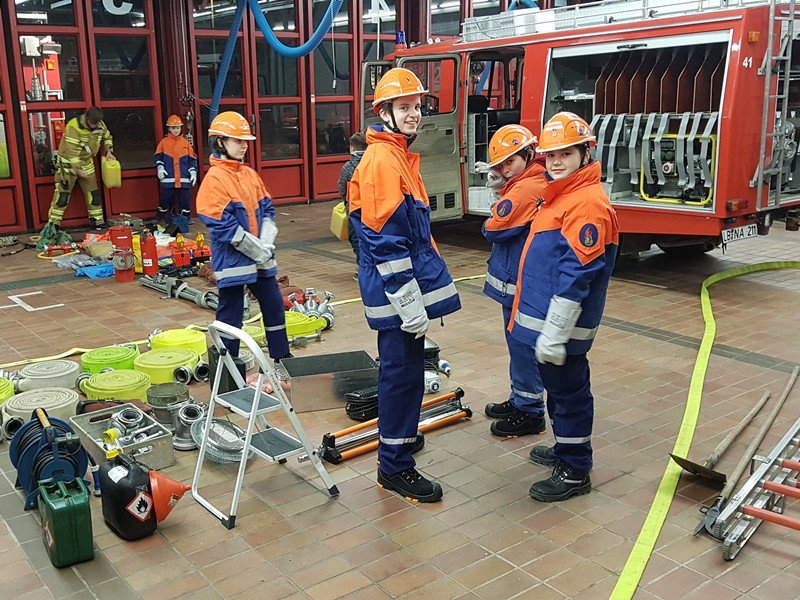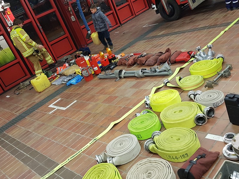Zunächst sind wir zum LF8 marschiert und räumten nach Befehl der Jugendleiter das komplette Einsatzfahrzeug bis auf den Stromgenerator und die Tragkraftspritze leer und legten die Gegenstände, welche wir ausräumten geordnet auf den Boden. Jeder Geräteraum (1 bis 3) wurde einer Gruppe zugeteilt. Da im Mannschaftsraum des LF8 sehr viele Gegenstände enthalten waren, wurde dieser Bereich von einer weiteren Gruppe ausgeräumt. Nun konnte man das, was wir gemacht haben "große Gerätekunde" nennen, denn der ganze Bereich um das LF8 war mit allen möglichen Ausrüstungsgegenständen der Feuerwehr umgeben. Schließlich gingen wir in unseren Gruppen zusammen und jeder musste der Reihe nach einen zufällig gewählten Gegenstand identifizieren und dessen Funktion benennen. Alle 20 Minuten rotierten die Gruppen im Uhrzeigersinn einmal. So schafften unsere Jugendleiter schließlich, den Jugendlichen, die gut aufgepasst haben, die Einsatzgeräte der Feuerwehr näher zu bringen und den Zweck von ihnen zu erklären.