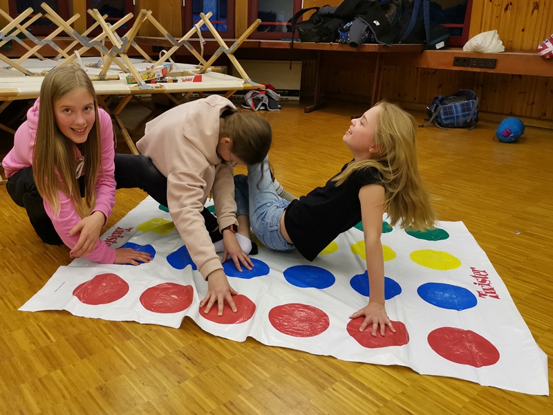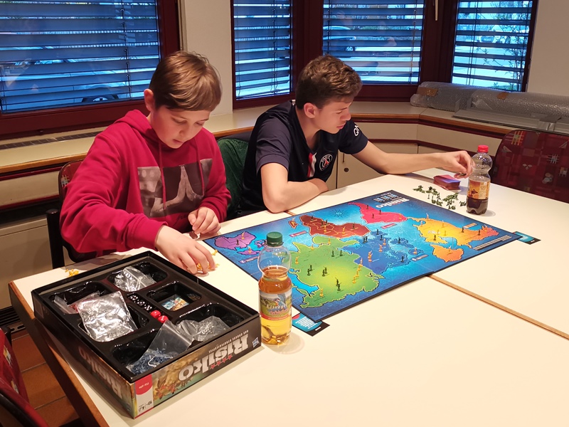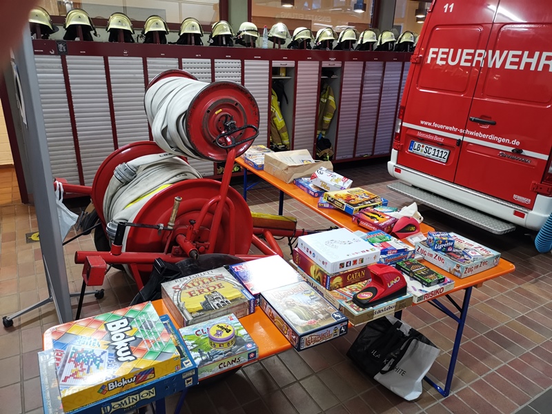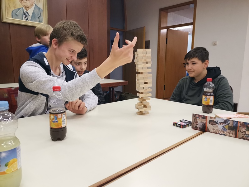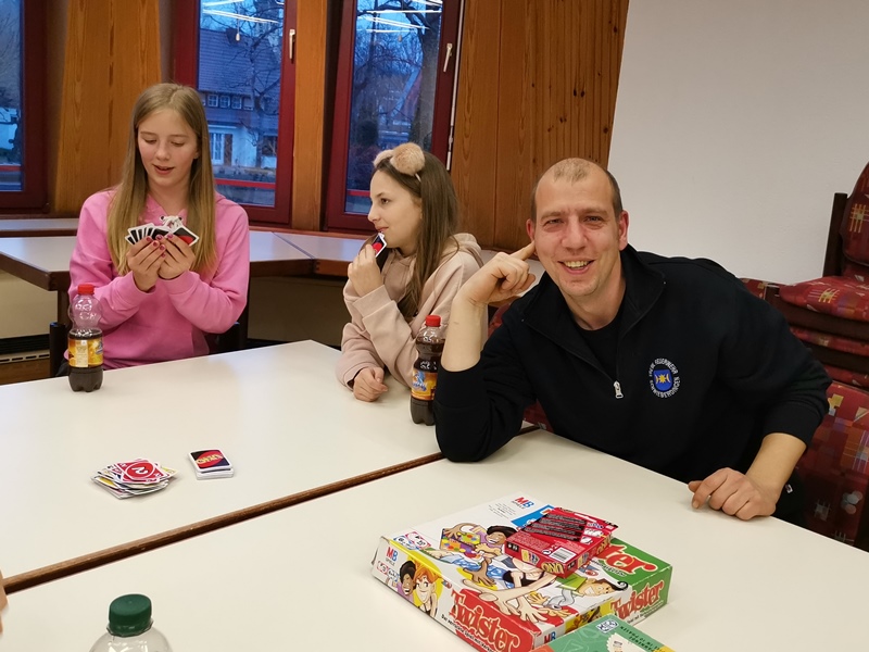 Noch vor dem Abendessen wurden alle Spiele in der Fahrzeughalle auf einer langen Tafel aufgebaut. Neben den Kartenspielen UNO und Co, waren auch Spiele wie Mensch Ärgere dich nicht, Twister, Jenga und Risiko vertreten. In der ersten Runde wurden mit den Jugendleitern ein paar Spiele angespielt.