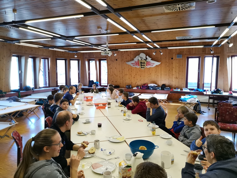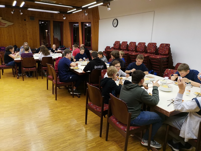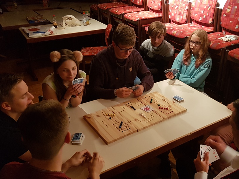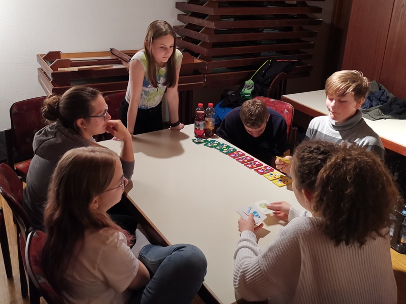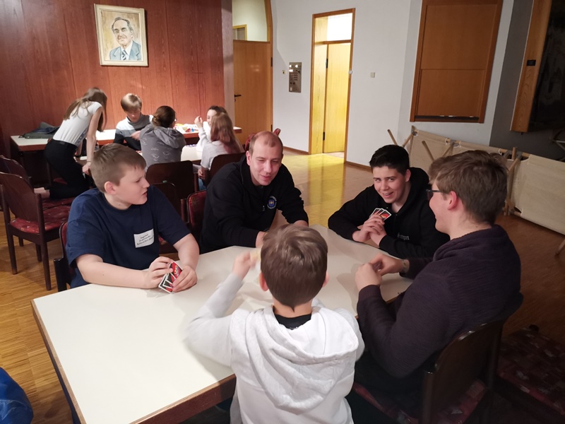 Gestärkt durch das gemeinsam gekochte Abendessen mit leckeren Nudeln und Bolognesesoße ging es in den Spieleabend. Nun folgten diverse Spiele. Wach gehalten von den aufregenden Runden UNO konnte man mit Apfelschorle und Chips die Nachtruhe weit nach hinten verlagern. Einige der Jugendlichen schafften es sogar bis zum Sonnenaufgang und konnten am Samstag gleich beim Frühstück unterstützen.