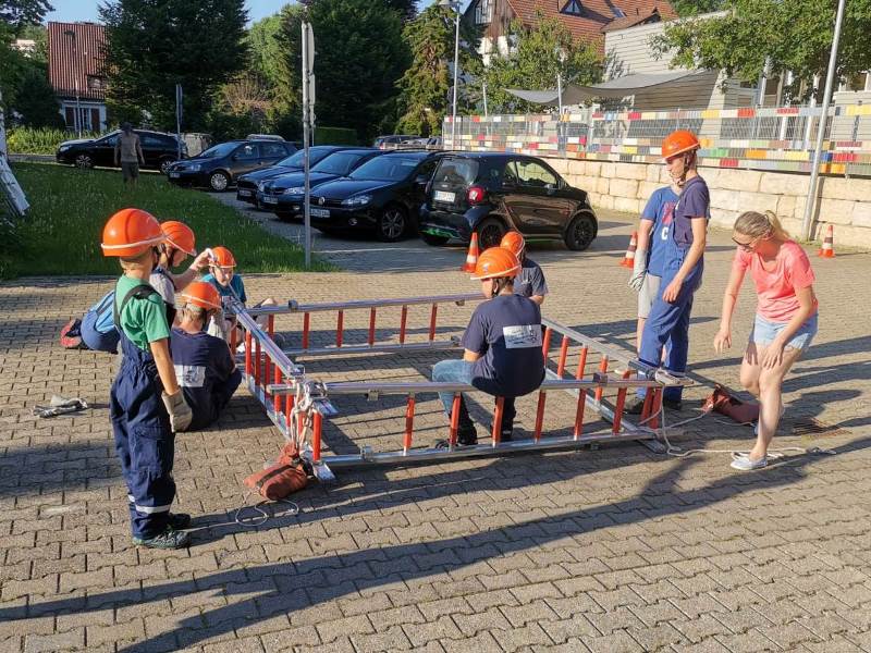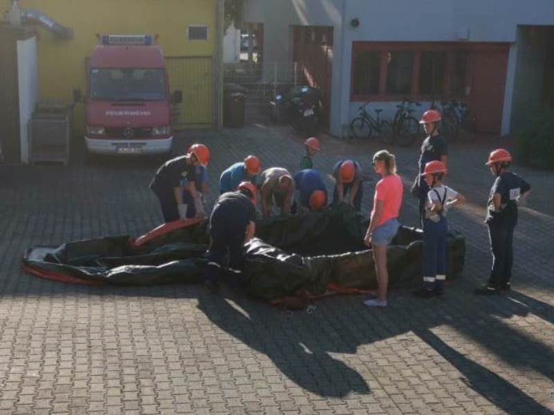 Gruppe 1 hatte die Aufgabe einen Pool zu bauen und Gruppe 2 sollte versuchen einen Springbrunnen zu konstruieren. Beide Aufgaben waren mit den zu findenden Sachen des uns zu Verfügung gestellten Fahrzeuges zu lösen. Gruppe 1 löste die Aufgabe, indem sie vier Leiterteile zu einem Viereck zusammen steckte. Anschließend wurden die Leitern mit Leinen gesichert und eine Plane darübergelegt. Nur noch das Wasser fehlte in unserem Selbst gebauten Pool. So eine Vorrichtung wird in Einsätzen benötigt, wenn jemand stark mit Gefahrengut in Berührung kommt und gereinigt werden muss.