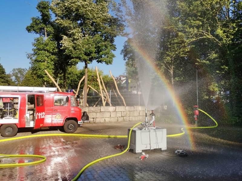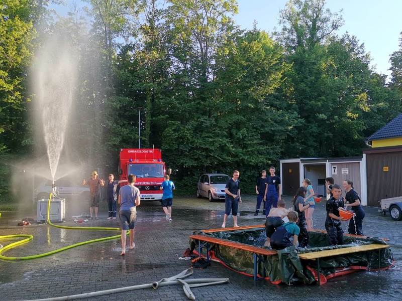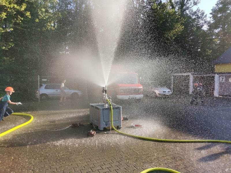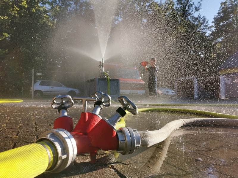 Gruppe 2 setzte einen Verteiler auf eine Stütze und schloss an zwei der Wasserausgänge ein Strahlrohr an. An den dritten Ausgang des Verteilers wurde die Wasserversorgung angeschlossen. Sobald das Wasser durch die Leitungen schoss, spritzte es in alle Richtungen. Mit diesen zwei Vorrichtungen hatten wir bis Ende des Abends noch sehr viel Spaß. Um nicht zu vergessen etwas zu trinken bei der Hitze, stellten uns die Leiter Getränke und jede Menge Wassermelone zu Verfügung. Als der Abend dann zu Ende ging bekam jeder noch ein Eis und eine unserer Leiterinnen wurde von der Jugendfeuerwehr verabschiedet. Nachdem wir uns abtrockneten gingen alle mit der Zeit nach Hause.