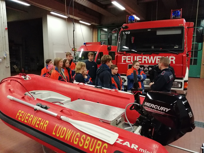 Begonnen haben wir unseren Rundgang an der Stelle, an der die Kameraden am Morgen ihren Dienst beginnen und die Diensteinteilung erfolgt. Gespannt haben wir zugehört, welche Aufgaben den ganzen Tag auf dem Plan stehen. Aufgeteilt in zwei Gruppen haben wir besonders die Fahrzeuge und Ausrüstungsgegenstände angeschaut, welche wir in Schwieberdingen nicht haben. So führte uns der Weg vorbei am Schlauchboot zu den Abrollbehältern und dem Rüstwagen.