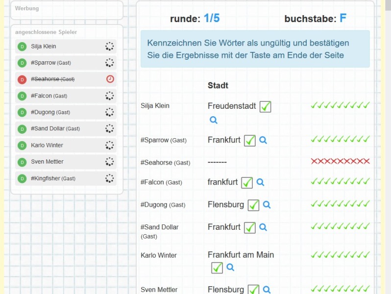 Nachdem wir uns kurz alle gemeinsam begrüßt hatten, teilten wir uns in kleinere Gruppen, um dort, ebenfalls über eine Website, Stadt, Land, Fluss mit verschiedenen Kategorien zu spielen. So gab es zum Beispiel Kategorien, die unser Feuerwehrwissen beanspruchten, wie Gründe für einen Einsatz und Feuerwehrgeräte, aber auch andere lustige Kategorien, beispielsweise Gründe fürs Zuspätkommen oder Waffen in einer Zombieapokalypse. Natürlich durften auch eher klassische Kategorien, wie Städte oder Obst nicht fehlen.