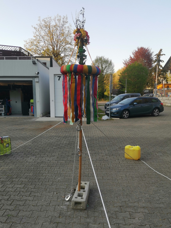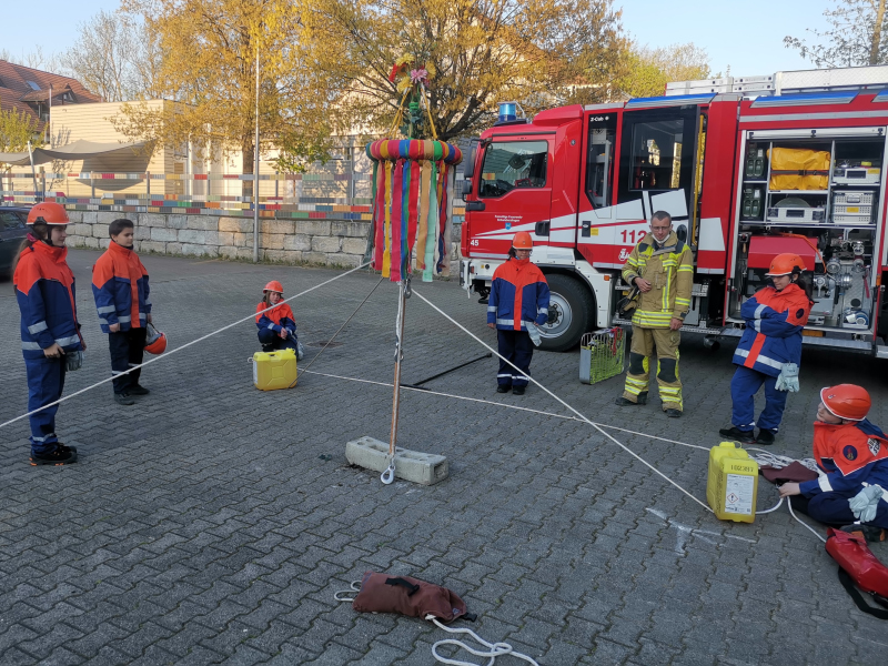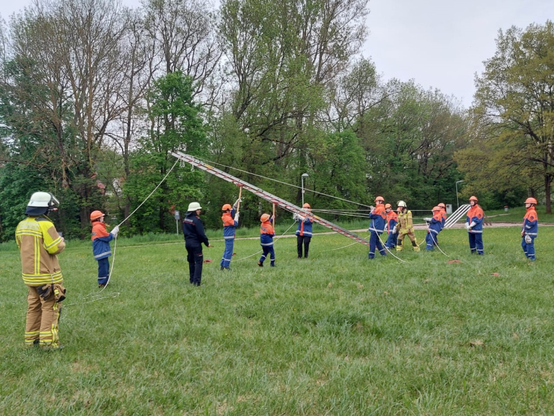Eine Ähnliche Übung stand am 05.05.2022 noch einmal auf dem Programm. Die Gruppe der 13 bis 15 jährigen musste ebenfalls einen Maibaum stellen und durfte nur Feuerwehrknoten zum Sichern verwenden. Unter dem kritischen Blick der Ausbilder nicht so einfach.