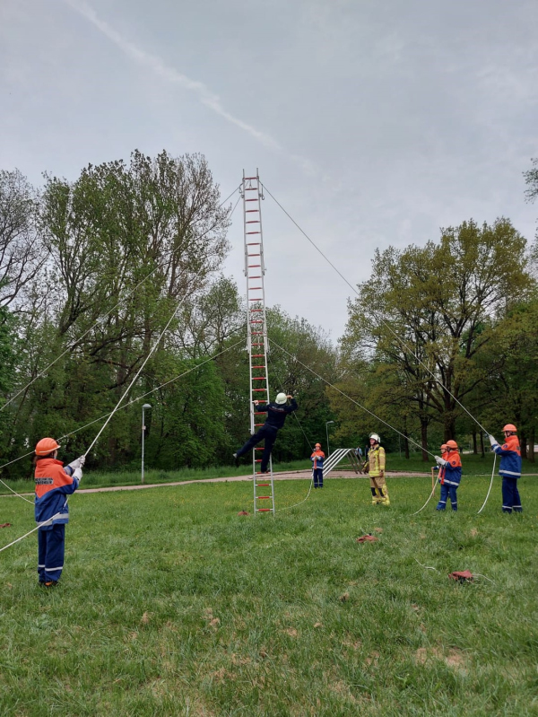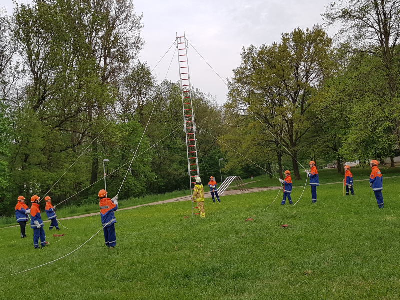Unsere Gruppe der 16 bis 18 jährigen hatte da noch eine etwas schwierigere Aufgabe. Es galt die 4 teilige Steckleiter mit einer Gesamthöhe von 8,4 m senkrecht auf der Wiese aufzustellen. Für den ersten Test mussten zwei Leiterteile herhalten. Mit den Absprachen der Jugendlichen und der Erkenntnis, dass die Schulphysik auch in der Feuerwehr gilt, stand die Leiter sehr schnell. Kniffeliger wurde es dann mit den vier Leiterteilen. Das Gesamtgewicht von über 40 kg frei im Raum zu fixieren war nicht ganz einfach. Doch mit der Hilfe aller Jugendlichen konnte die Leiter dann erfolgreich aufgestellt und sicher abgespannt werden.