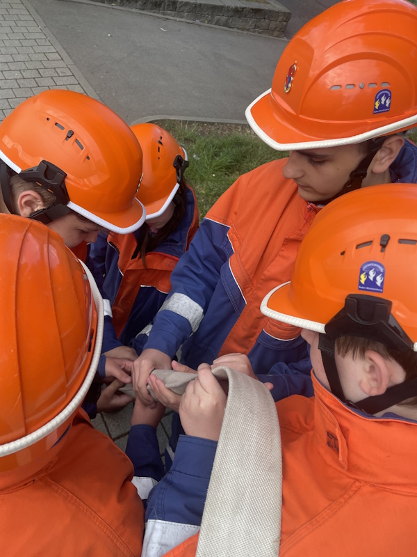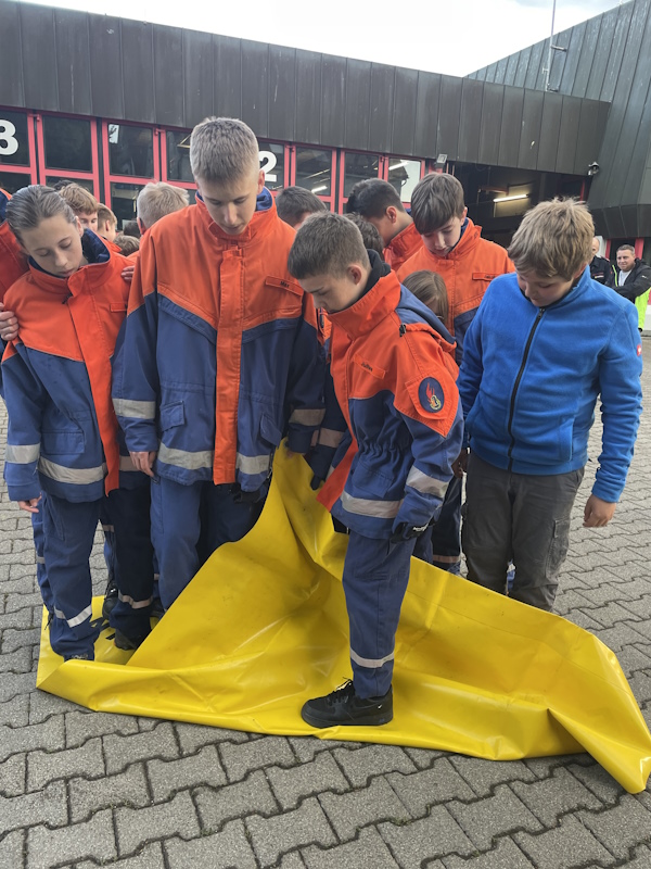 Zum Abschluss wurde es noch einmal spannend: für zwei verbliebene Gruppen ging es um alles. Zunächst musste eine Bereitstellungsplane auf Zeit doppelt gewendet werden. Anschließend folgte die nächste Herausforderung: Ein Leinenbeutel wurde zur Wäscheleine umfunktioniert – und diese musste durch die Ärmel der Feuerwehrjacken gefädelt werden, ohne dass die Jacken ausgezogen werden durften.
