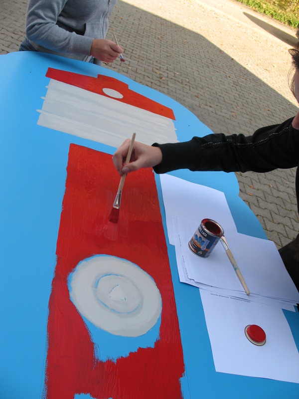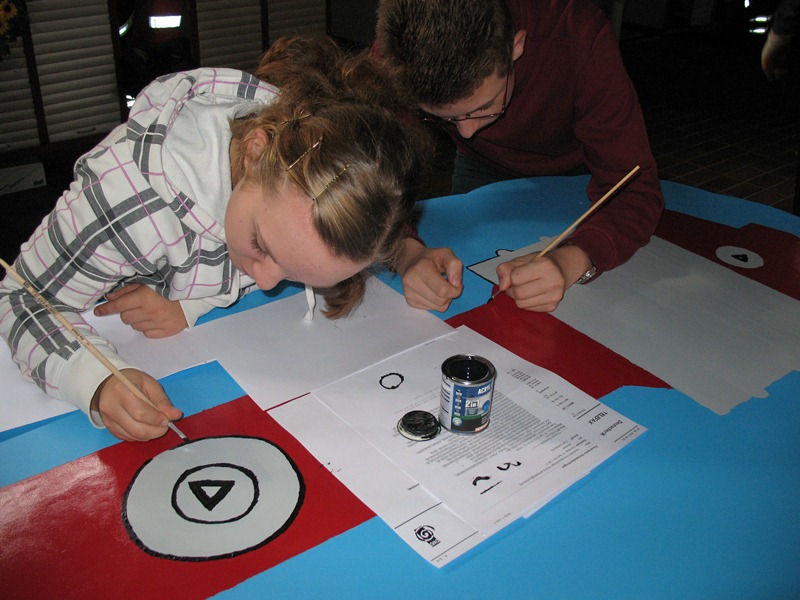 Bisher lagen die Zeitungen teils ungelesen in der Ecke, verstaubten und keiner wusste was aktuell im Land für JF-Aktionen laufen. So gab es schon in der Planungsphase ausgedehnte Diskussionen über die Vielzahl an Umbaumöglichkeiten. Zum Schluss wurde von den Jugendlichen eine Idee aufgegriffen, die so schlicht und einfach war, wie der Titel selbst - wir bauen einen Hydranten für unseren Hydrant. Gesucht wurden also die verschiedensten Bilder von Hydranten weltweit. Zielgenau wurde das Internet mit Suchmaschinen nach Bildern durchforstet. Am Ende der Suche wurde sich für ein Fallmantelmodell entschieden,  so ein Modell wie es auch im Feuerwehrübungshof steht und den Jugendlichen in der Handhabung bekannt ist. Bei allen nassen Übungen im Sommer ist dieser Hydrant ein guter Kamerad und sollte damit auch Einzug in den Jugendraum halten. Das Bild des Hydranten wurde mit einem Beamer an die Wand projiziert und die Abmaße ausgemessen. Zusammen ging es dann zum Baumarkt um Holzplatte, Farben und Pinsel zu besorgen. Leuchtrot sollte der Standfuß werden, umrahmt von einem schönen Himmelblau. Wieder im Gerätehaus angekommen wurde die Holzplatte an der Wand befestigt und die Projektion des Hydranten übernommen. Die Kontur wurde anschließend mit elektronischer Unterstützung ausgeschnitten. Da die Farben eine gewisse Zeit zum Trocknen benötigten, zog sich die Umbauaktion über die gesamte Herbstferienwoche hin. Am Samstag war es dann aber so weit, unser Hydrant hängt an der Wand und wartet auf die neuen Infos vom Hydrant.