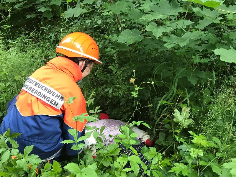Nachdem die letzten Übungen sehr theoretischer Natur waren, stand bei sonnigem Wetter am 06.06.2019 wieder Praxis auf dem Dienstplan. Eingeteilt in zwei Gruppen ging es zur Holzbrücke über die Glems und es wurden die Knobelaufgaben verteilt. Die jüngeren bekamen die Aufgabe, einer hoch komplizierten Personenrettung im Bereich des ehemaligen Mühlengrabens am Zulauf der Bruckmühle. Die älteren Jugendlichen hatten die nicht minder komplexe Aufgabe, einen noch unbekannten Gegenstand aus der Glems zu bergen.