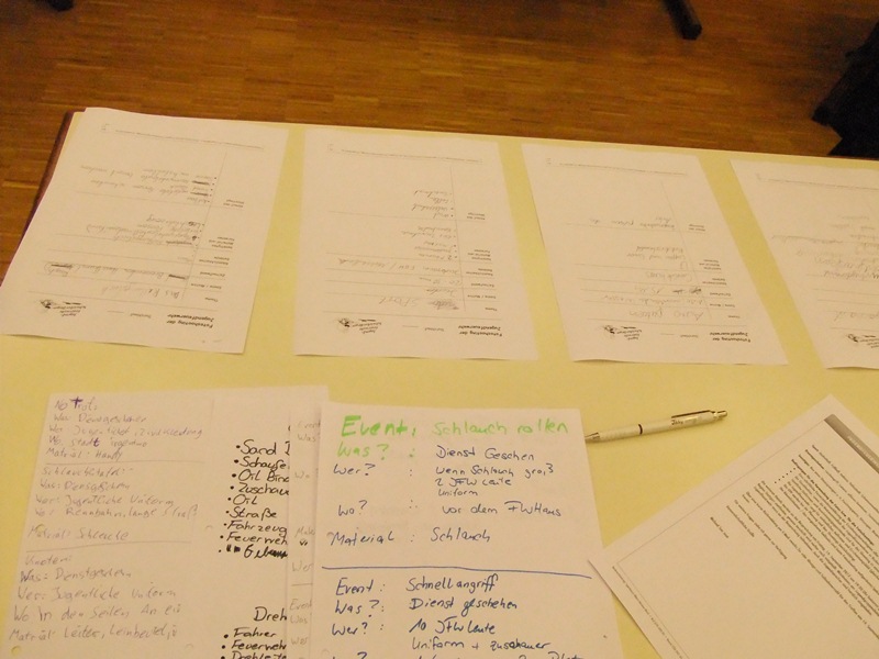 Ziel des Projektes ist es, für zukünftige Werbemaßnahmen, aktuelle Bilder zu liefern. Die Arbeit im Vorfeld des Fotoshootings besteht dabei im Wesentlichen darin, für unsere beiden Themenschwerpunkte, Szenen und Motive zu finden. Unsere großen Themenschwerpunkte sind Sport und Dienstgeschehen. In den Übungen am 11.10. und 18.10. haben wir Schlagworte gesammelt. Alle diese Motivvorschläge haben wir danach an einer Wäscheleine am Feuerwehrauto befestigt und uns in kleinen Gruppen Gedanken dazu gemacht.
