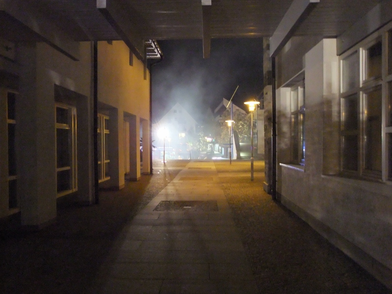 Der Einsatzleiter teilte nach kurzer Erkundung die nachfolgenden Einsatzkräfte ein und wies ihnen ihre Aufgaben zu. So wurde die Mannschaft des ersten Löschfahrzeuges (LF 16/12-1) zur Tiefgarageneinfahrt beordert und für die Menschenrettung eingeteilt. Die Mannschaft des zweiten Löschfahrzeuges (LF 16/12-2) erhielt ebenfalls den Auftrag zur Menschenrettung, allerdings über den Fußgängerzugang vom Schlosshof. Beide Einheiten setzten ihre vorgehenden Trupps unter Atemschutz ein und nahmen jeweils entsprechende Schlauchleitungen vor. Zur Sicherstellung der Wasserversorgung rückte ein weiteres Löschfahrzeug (LF 8/8) nach und erhielt den Auftrag zur Wasserentnahme von der Glems. Die unter Atemschutz vorgehenden Trupps fanden zügig die „vermisste Person" und konnten sie zur Versorgung an der Rauchgrenze an weiteres Personal übergeben. Nach der parallel erfolgreich durchgeführten „Brandbekämpfung" wurde der verrauchte Bereich mittels Belüftungsgeräten rauchfrei gemacht und die Übung durch den Einsatzleiter beendet.
