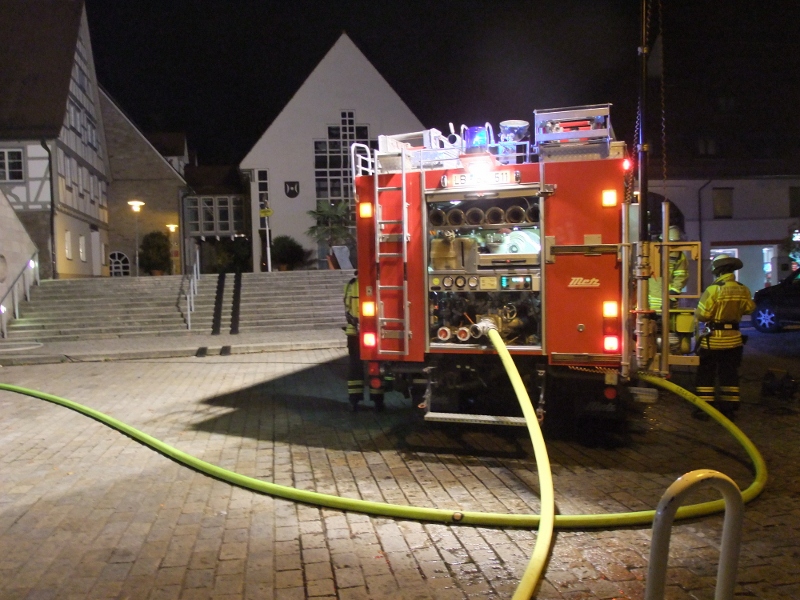 Am Montag, 08. Oktober 2012 konnte die Einsatzabteilung die Tiefgarage des Rathauses für eine Übung zur Menschenrettung und Brandbekämpfung nutzen. Dank der guten Zusammenarbeit mit der Gemeindeverwaltung wurde auf frühzeitige Anfrage durch die Feuerwehr diese Übung durch die Mitarbeiter des Rathauses möglich gemacht und auch entsprechend die Mieter von Stellplätzen rechtzeitig verständigt. Mit einer Nebelmaschine wurde die untere Parkebene künstlich verraucht und es wurde eine Übungspuppe deponiert. So konnte die Übung mit dem Einsatzstichwort „Rauchentwicklung in der Tiefgarage Rathaus, eine Person vermisst" eingeleitet werden.