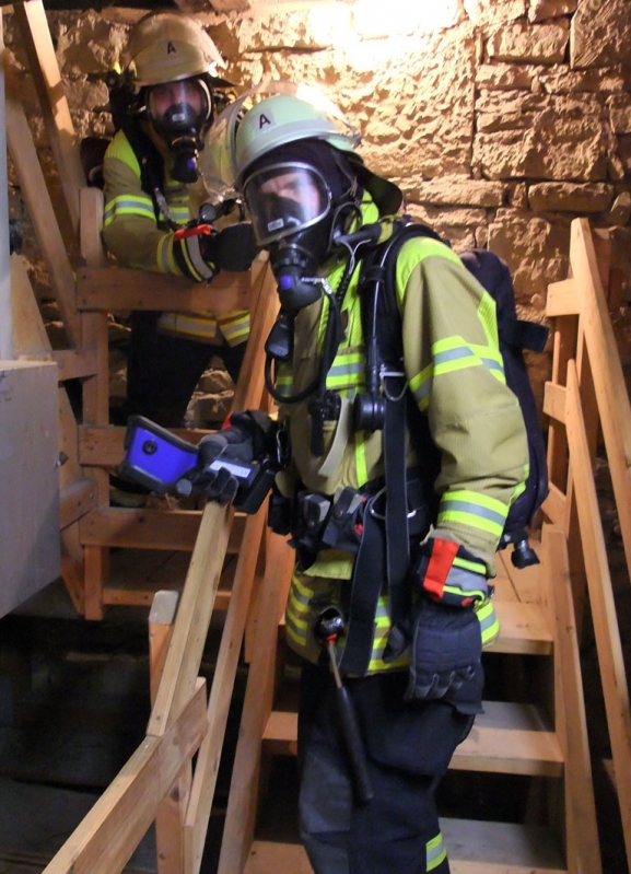 Für die vorgehenden Trupps bestand die Aufgabe, sich mit dem notwendigen Material zur Brandbekämpfung unterhalb der Brandstelle ein sogenanntes „Basisgeschoss“ im gesicherten Bereich einzurichten. Erschwert wurde der Aufstieg durch den verengten Eingang bzw. die enge Wendeltreppe und durch schmale, teilweise steile Holztreppen. Nach der Bereitstellung im Basisgeschoss und der verlegten Schlauchleitung wurde dann der eigentliche Löschangriff bis über den Glockenstuhl vorgetragen.