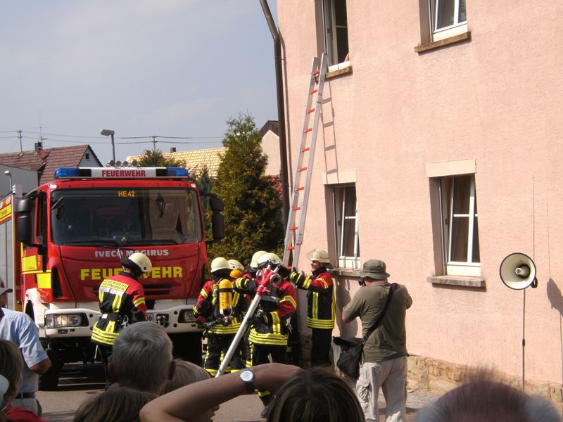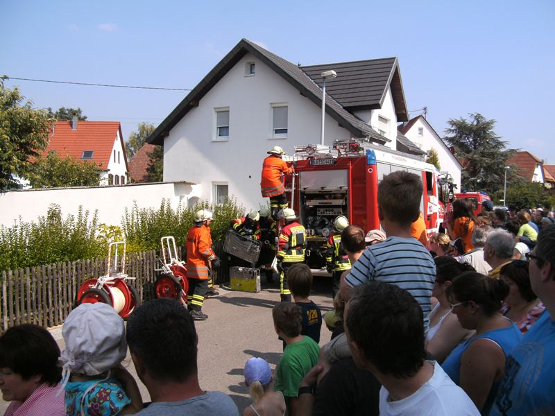 Nach einer Viertelstunde ist auch die Puppe aus der Hobbywerkstatt im Keller des Hauses gerettet, wo der mit Raucherzeugern simulierte Brand ausgebrochen war. Zwei Druckbelüfter fegen nicht nur die letzten Rauchschwaden aus dem Haus, sondern bieten auch den zwar neu gekleideten, aber bei hochsommerlichen Temperaturen dennoch gut erhitzten Löschtrupps auf ihrem Rückweg durch das Treppenhaus eine willkommene Abkühlung. Die brennende Sonne kann keine noch so gut ausgerüstete Feuerwehr bekämpfen. Und auf erfrischende Wasserspiele warteten die überwiegend jungen Zuschauer in diesem Jahr trotz des Brandes vergebens.