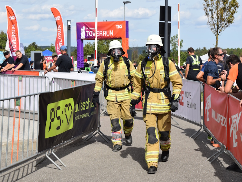 Über den gesamten Lauf trugen die Teilnehmer die persönliche Schutzausrüstung, bestehend aus der Einsatzjacke und -hose, Feuerwehrstiefeln, dem Helm und dem Atemschutzgerät. Somit kommt man auf etwa 20kg Zusatzgewicht, die mit ins 28. Stockwerk getragen werden müssen.