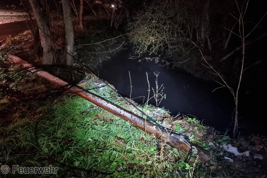 Nach dem Sturz zweier Telefonmasten und dem Abriss der daran befestigten Leitung wurde die Feuerwehr zu Sicherungsarbeiten alarmiert. Die Masten wurden am Straßenrand abgelegt und die getrennten Leitungen von der Fahrbahn entfernt.