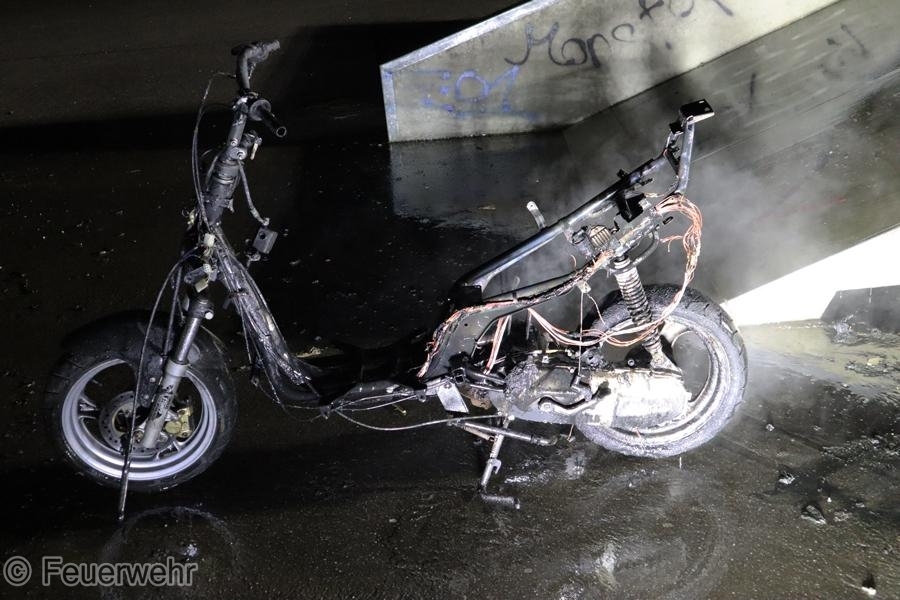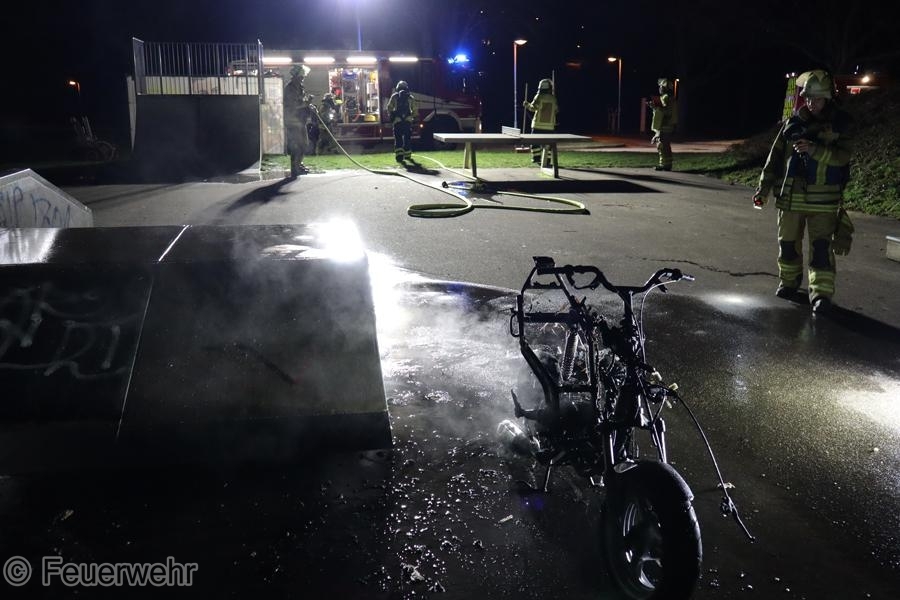 Zu einem brennenden Motorroller wurde die Feuerwehr am Sonntagabend zur Skateranlage in den Herrenwiesenweg gerufen. Das Feuer wurde durch einen Atemschutztrupp mit dem Schnellangriff abgelöscht. Die Einsatzstelle wurde abschließend mit der Wärmebildkamera kontrolliert und der Polizei übergeben.
