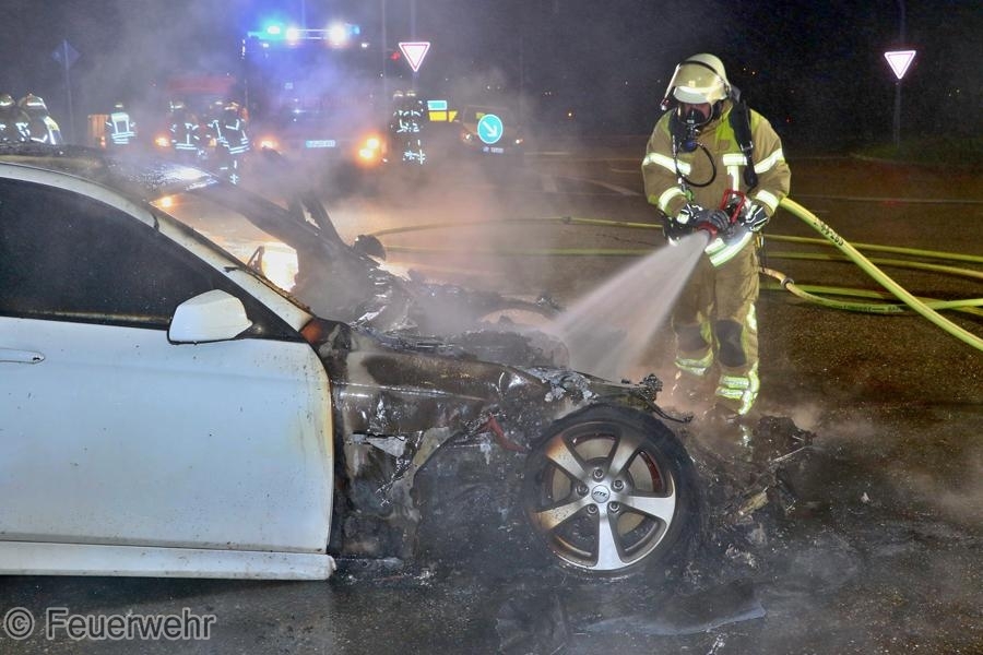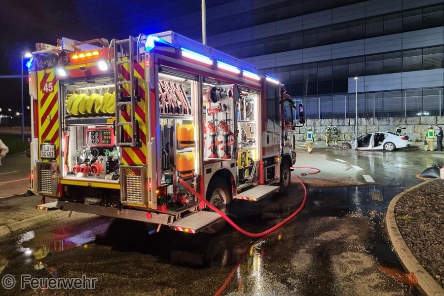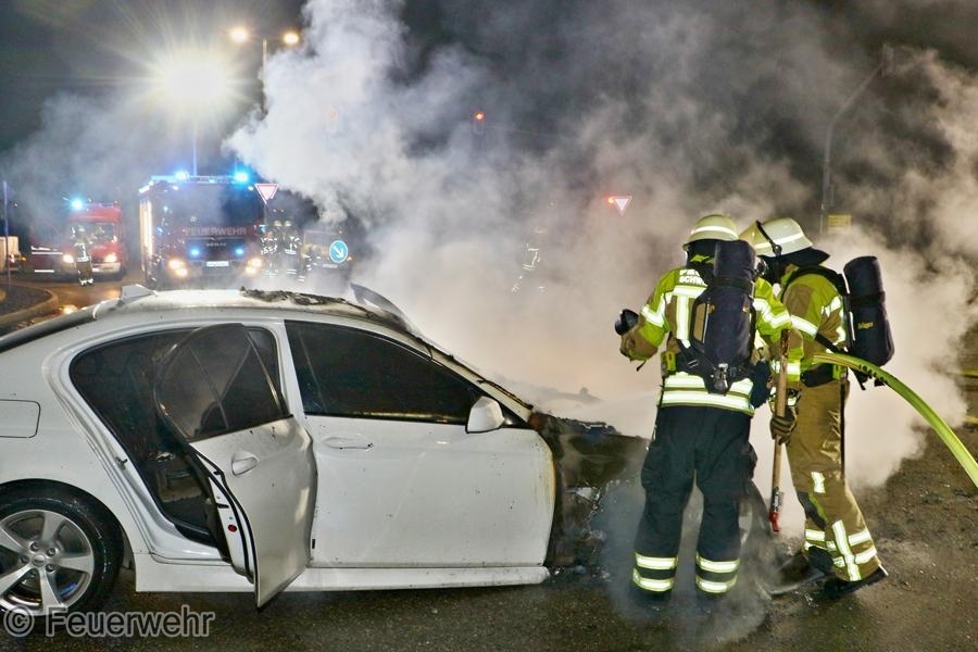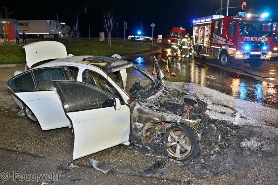 Ein BMW der 5er-Reihe ist am Montag (25.03.2024) in der Robert-Bosch-Straße in Schwieberdingen komplett ausgebrannt. Ein 51-Jähriger und sein 58-jähriger Beifahrer waren gegen 23:25 Uhr mit dem Fahrzeug unterwegs, als sich aus noch unbekannter Ursache ein Brand im Bereich des Motorraums entwickelte. Der Fahrer stoppte das Fahrzeug und verständigte die Feuerwehr, bei deren Eintreffen der BMW bereits in Vollbrand stand. Das völlig ausgebrannte Fahrzeug musste nach Beendigung der Löschmaßnahmen abgeschleppt werden. An dem Fahrzeug sowie der Fahrbahn entstand nicht unerheblicher Sachschaden. Für die Dauer der Löscharbeiten musste die Robert-Bosch-Straße im Bereich der Einmündung zur Ludwigsburger Straße komplett gesperrt werden.