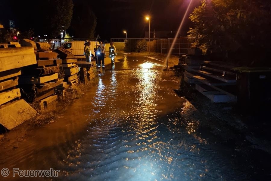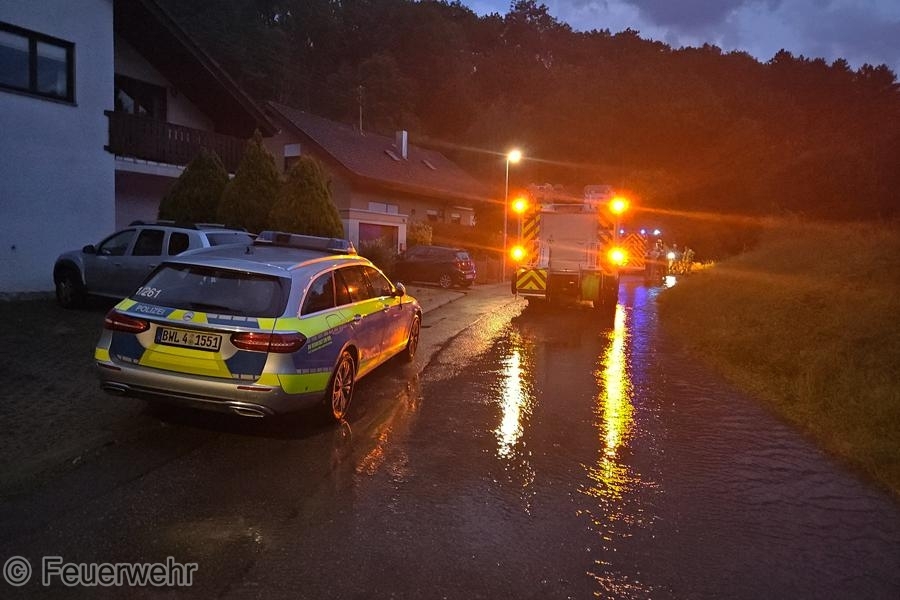Nach einem Starkregenereignis wurde die Feuerwehr von Anwohnern in den Münchinger Weg gerufen. Dort war die Straße durch das sich sammelnde Oberflächenwasser an mehreren Stellen überschwemmt. Durch die Feuerwehr wurde die Straße gesperrt und die Gulliabläufe gereinigt, sodass das Wasser wieder besser ablaufen konnte. Gemeinsam mit dem ebenfalls eingetroffenem Bürgermeister wurden das Einlaufbauwerk sowie die Gebäude entlang der Straße kontrolliert. Nach den durchgeführten Maßnahmen sank der Wasserstand, sodass der Einsatz beendet werden konnte.