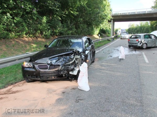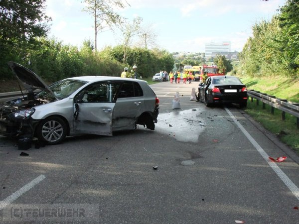 Zu einem schweren Verkehrsunfall kam es heute Nachmittag auf der Bundesstraße 10 bei Schwieberdingen. Eine in Richtung Vaihingen an der Enz fahrende 25 Jahre alte Mazda-Fahrerin kam kurz nach 17.00 Uhr zwischen den Anschlussstellen Schwieberdingen-West und Schwieberdingen-Mitte aus bislang unbekannter Ursache auf die Gegenfahrbahn, wo es zum Frontalzusammenstoß mit dem ordnungsgemäß entgegenkommenden VW eines 26-Jährigen kam. Während der Mazda anschließend mit einem in Richtung Stuttgart fahrenden Seat einer 51-Jährigen kollidierte, wurde der VW zunächst in die rechte Leitplanke geschleudert. Im weiteren Verlauf prallte der VW frontal auf einen in Richtung Vaihingen fahrenden BMW, dessen 67 Jahre alter Fahrer einen Zusammenstoß nicht mehr verhindern konnte. Bei dem Verkehrsunfall wurden die drei beteiligten Fahrzeuglenker und eine 52 Jahre alte Beifahrerin im Mazda verletzt. Sie wurden vom Rettungsdienst, der mit vier Fahrzeugen an der Unfallstelle im Einsatz war, in umliegende Krankenhäuser gebracht. Die Feuerwehr Schwieberdingen war zur Bergung mit zwei Fahrzeugen und 15 Einsatzkräften vor Ort. Für die Unfallaufnahme und zur Umleitung des Verkehrs war die Polizei mit fünf Streifenbesatzungen am Unfallort.