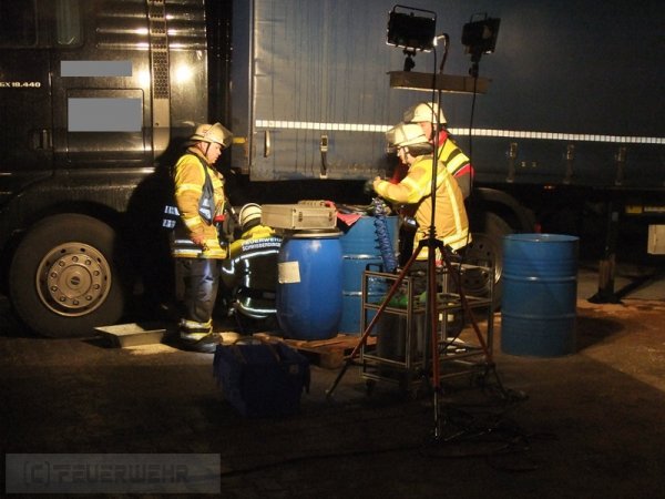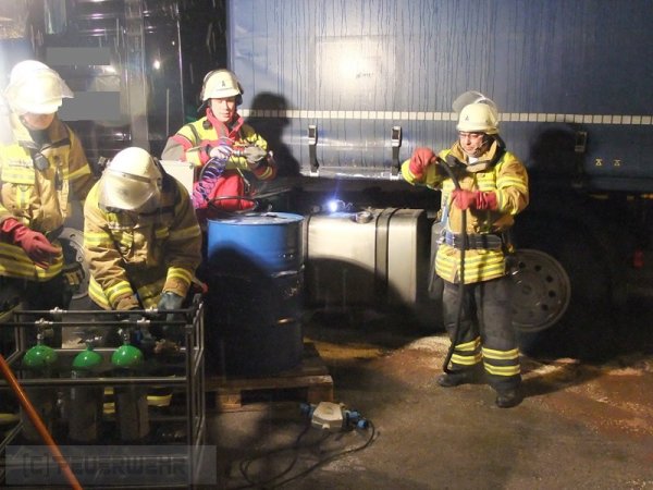 Bei der Erkundung stellte sich heraus, dass aus einem ca. 2 cm großen Loch Diesel austrat. Vorsorglich hatten die Mitarbeiter der Spedition schon Schachtabdeckungen ausgelegt, wodurch ein Eindringen des Diesels in die Kanalisation in größerem Umfang vermieden werden konnte. Auf dem Betriebshof wurde eine Fläche von ca. 400 m² mit Bindemittel abgestreut. Mit der Unterstützung der Werkfeuerwehr Bosch konnten die noch fast vollen Tanks umgepumpt und ein weiteres Auslaufen von Kraftstoff unterbunden werden. Vor Ort war ebenfalls ein Vertreter des Landratsamt.