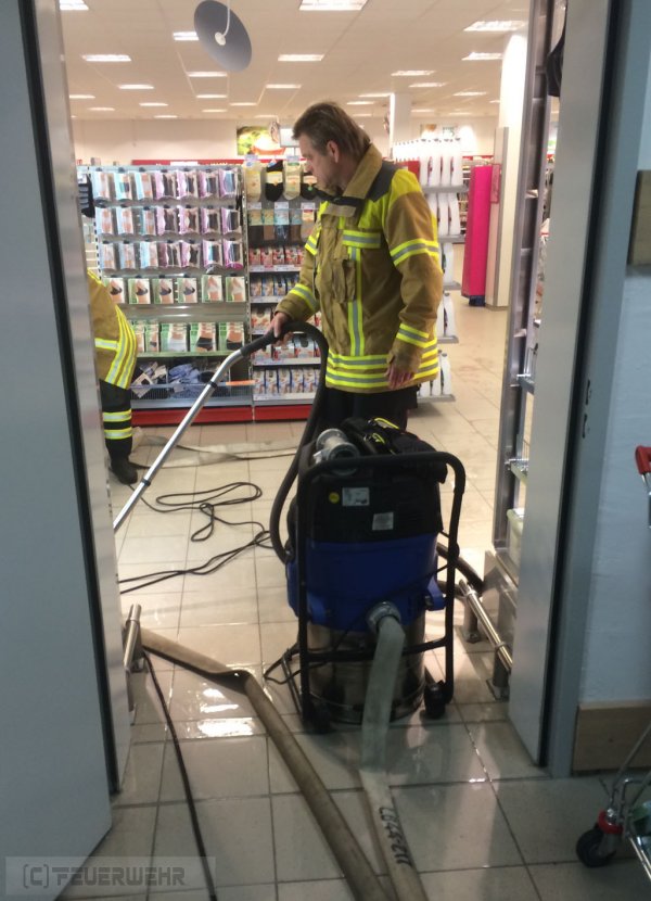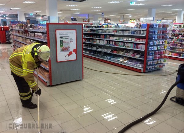 Durch einen technischen Defekt in der Gästetoilette eines Drogeriemarktes wurde die komplette Verkaufsfläche des Marktes und ein angrenzendes Schuhgeschäft überflutet. Es wurden mehrere Wassersauger eingesetzt um den Schaden zu beseitigen.