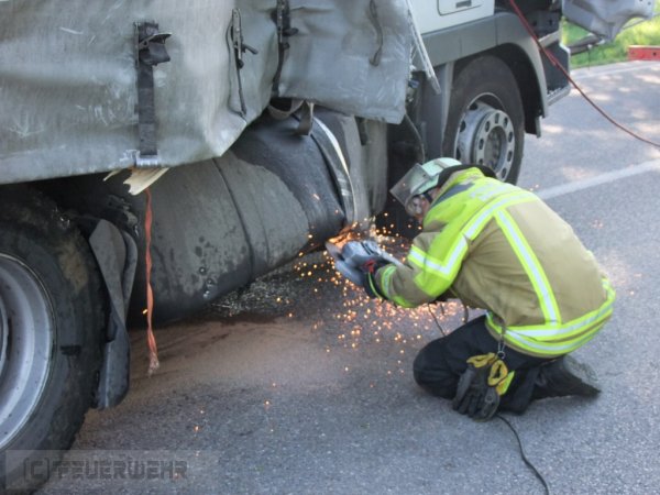 Zur selben Zeit wurde der bereits auslaufende Tank durch die Einsatzkräfte abgedichtet und mit einer Umfüllpumpe in Stahlfässer umgefüllt.
