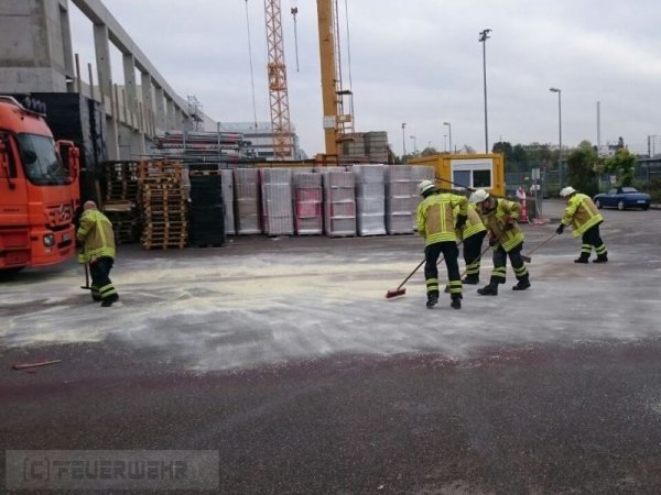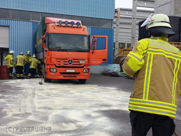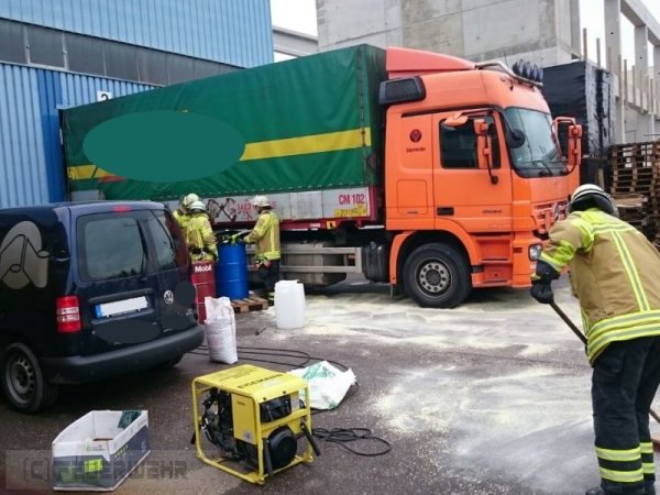 Aus dem Tank eines LKWs trat ungewollt viel Kraftstoff aus, welcher sich auf dem Betriebsgelände großflächig verteilte. Die Feuerwehr streute den bereits ausgetretenen Kraftstoff ab und pumpte den restlichen Kraftstoff in drei 200-Liter-Fässer um.