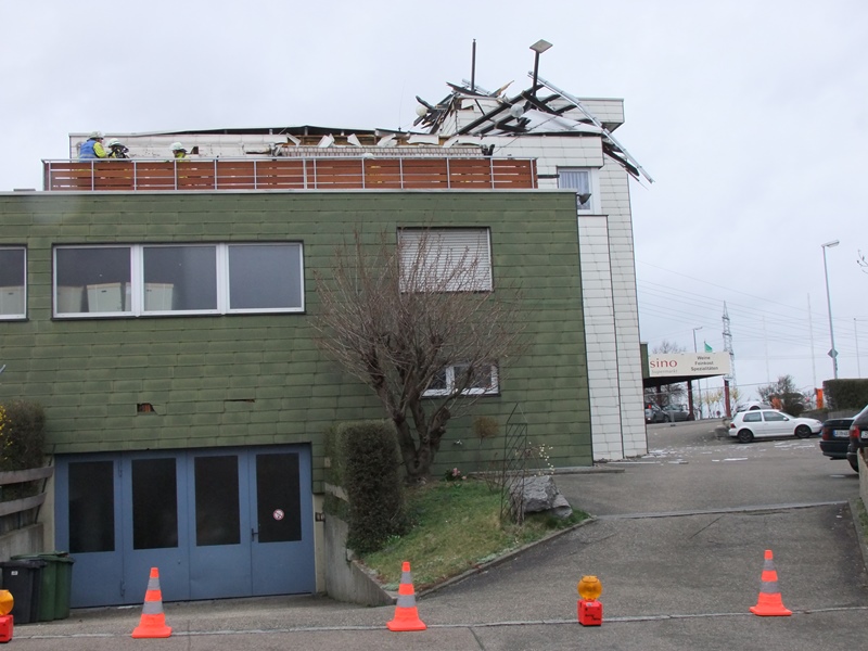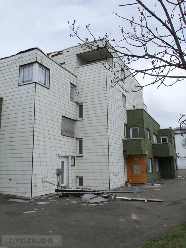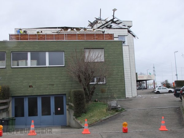 Durch das Sturmtief "Niklas" wurde die komplette Überdachung einer Terrasse abgerissen und auf die nächsthöhere Dachebene befördert. Teile hingen über die Hausfassade hinaus und drohten abzustürzen. Durch die Feuerwehr wurde die Umgebung abgesperrt und der Zustand gesichert. In Absprache mit dem Besitzer und einer Fachfirma konnte die Gefahr durch weiter Maßnahmen beseitigt werden.