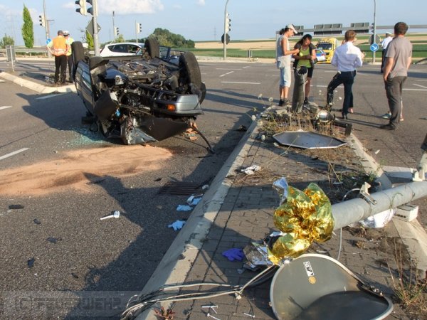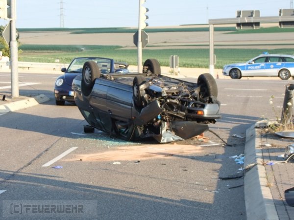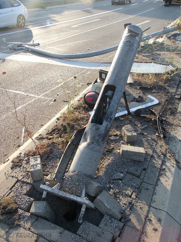 Ludwigsburg (ots) - Heute gegen 19.25 Uhr befuhren ein 7,5-Tonner und der Fahrer eines VW Golf, 46 Jahre alt, die Landesstraße L1141 von Münchingen kommend in Richtung Markgröningen. An der Kreuzung der L1141 mit der Landesstraße L1140, die zweispurig in Richtung Markgröningen führt, wollte der Lenker des Pkw links am Lkw vorbei fahren. Der Fahrer des Lkw kam jedoch mit seinem Fahrzeug aus bislang ungeklärter Ursache nach links auf die Fahrspur des Pkw, der daraufhin ausweichen musste. Durch den Ausweichvorgang prallte der Pkw-Lenker gegen einen dort befindlichen Ampelmast, sein Fahrzeug überschlug sich und blieb auf dem Dach liegen. Der Fahrer des Pkw wurde schwer verletzt und musste durch den Rettungsdienst in ein Krankenhaus gebracht werden. Der Lkw-Lenker fuhr, ohne sich um den Unfall zu kümmern, weiter in Richtung Markgröningen. Ein Zeuge fuhr diesem noch hinterher und konnte das Kennzeichen ablesen. Ermittlungen zum Fahrer des Lkw wurden eingeleitet. Durch den Aufprall des Pkw war der Ampelmast an der Kreuzung so verbogen worden, dass er von der Straßenmeisterei abflext werden musste. Die Ampel kann erst im Laufe des morgigen Tages provisorisch wieder in Betrieb genommen werden. Es wird daher mit Auswirkungen auf den morgendlichen Berufsverkehr gerechnet. Die Polizei wird vor Ort sein und ggf. verkehrslenkend eingreifen. Der entstandene Sachschaden an der Lichtzeichenanlage wurde mit 15.000 Euro angegeben, am Pkw entstand wirtschaftlicher Totalschaden in Höhe von etwa 2.000 Euro. Ein vorbeifahrender Audi war von Trümmerteilen der Lichtzeichenalage getroffen worden, dadurch entstand Sachschaden in Höhe von etwa 1.500 Euro. Am verursachenden Lkw war kein Sachschaden entstanden. Die Freiwillige Feuerwehr Schwieberdingen war mit 20 Wehrleuten und drei Fahrzeugen vor Ort, der Rettungsdienst war mit einem Notarztwagen und vier Sanitätern eingesetzt, die Polizei mit drei Fahrzeugen und 6 Beamten.