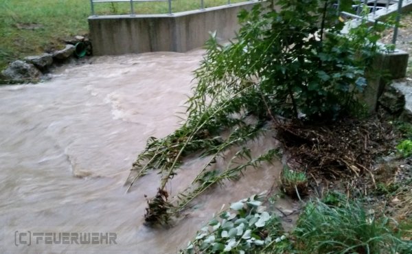 Die Feuerwehr kontrollierte in Folge der starken Regenfälle das Einlaufbauwerk vom Räuschelbach im Münchinger Weg. Aufgrund des steigenden Wasserstandes und der Rückstauung wurde vorsorglich eine Sandsackbarriere am Ufer errichtet.