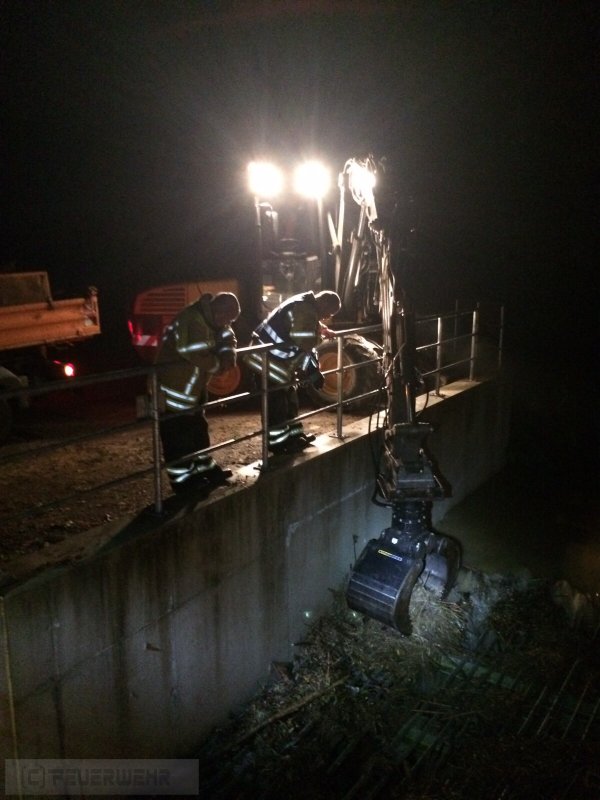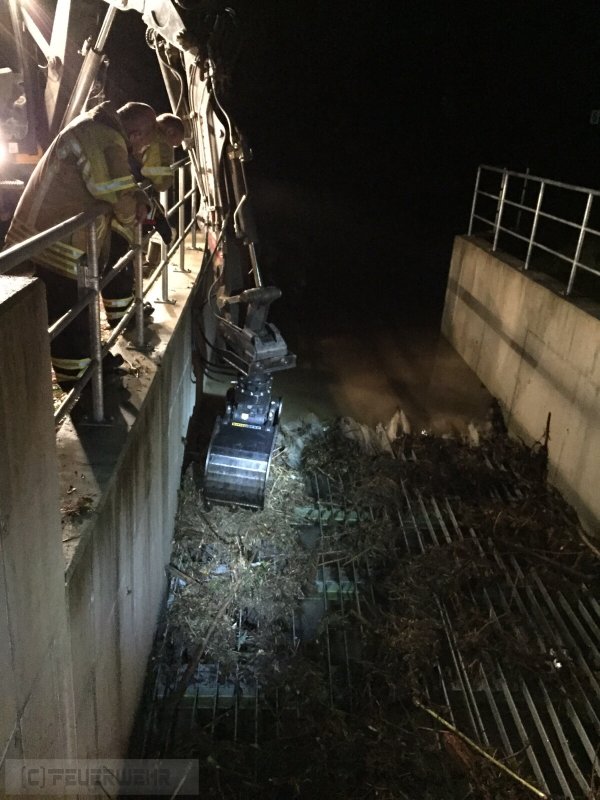 Im weiteren Verlauf wurde der Bauhof unterstützt, welcher mit Hilfe eines Baggers die Einlaufgitter vom angespülten Geäst und Gras befreite, so dass das Wasser ungehindert abfließen konnte.