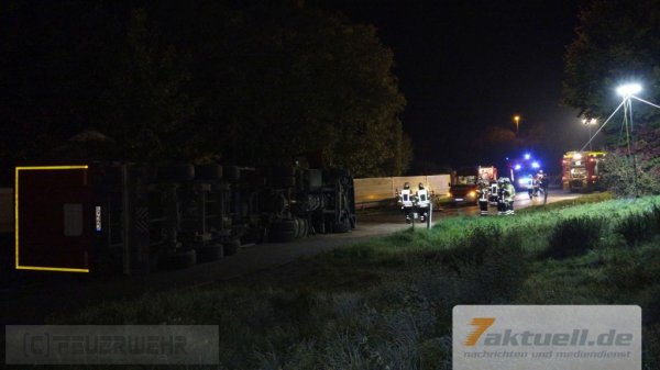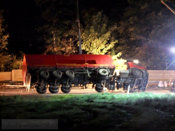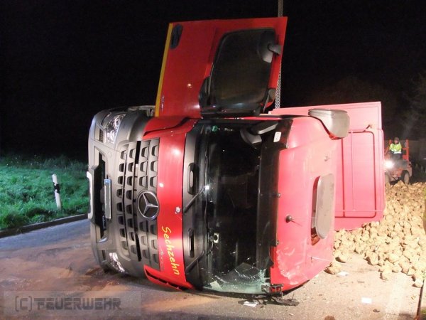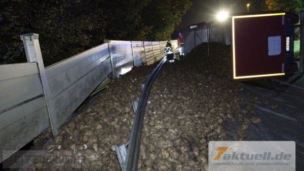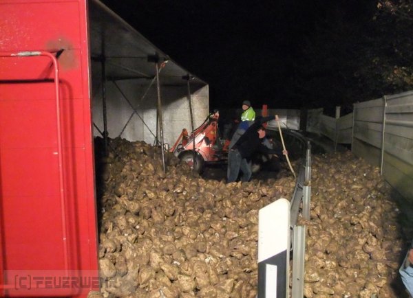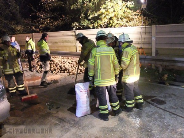 Die Feuerwehr wurde in den Bereich der B10 Abfahrt Mitte zu einem Verkehrsunfall eines LKWs alarmiert. Ein 40-Tonner-LKW kippte im Bereich der Kurve auf die Seite um und verlor ca. 200 Liter Dieselkraftstoff sowie seine komplette Ladung an Zuckerrüben. Die Feuerwehr nahm den Krafststoff mit Bindemittel auf und leuchtete die Einsatzstelle aus. Der verunglückte Sattelzug wurde mittels eines Krans aufgerichtet und abtransportiert. Die Zuckerrüben konnten mittels eines Traktors durch Mitarbeiter der zuständigen Transportfirma ebenfalls abtransportiert werden. Der Einsatz zog sich bis in die frühen Morgenstunden.